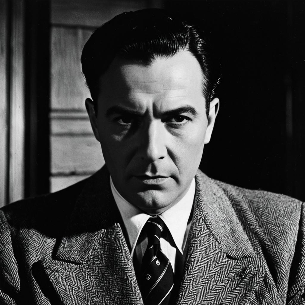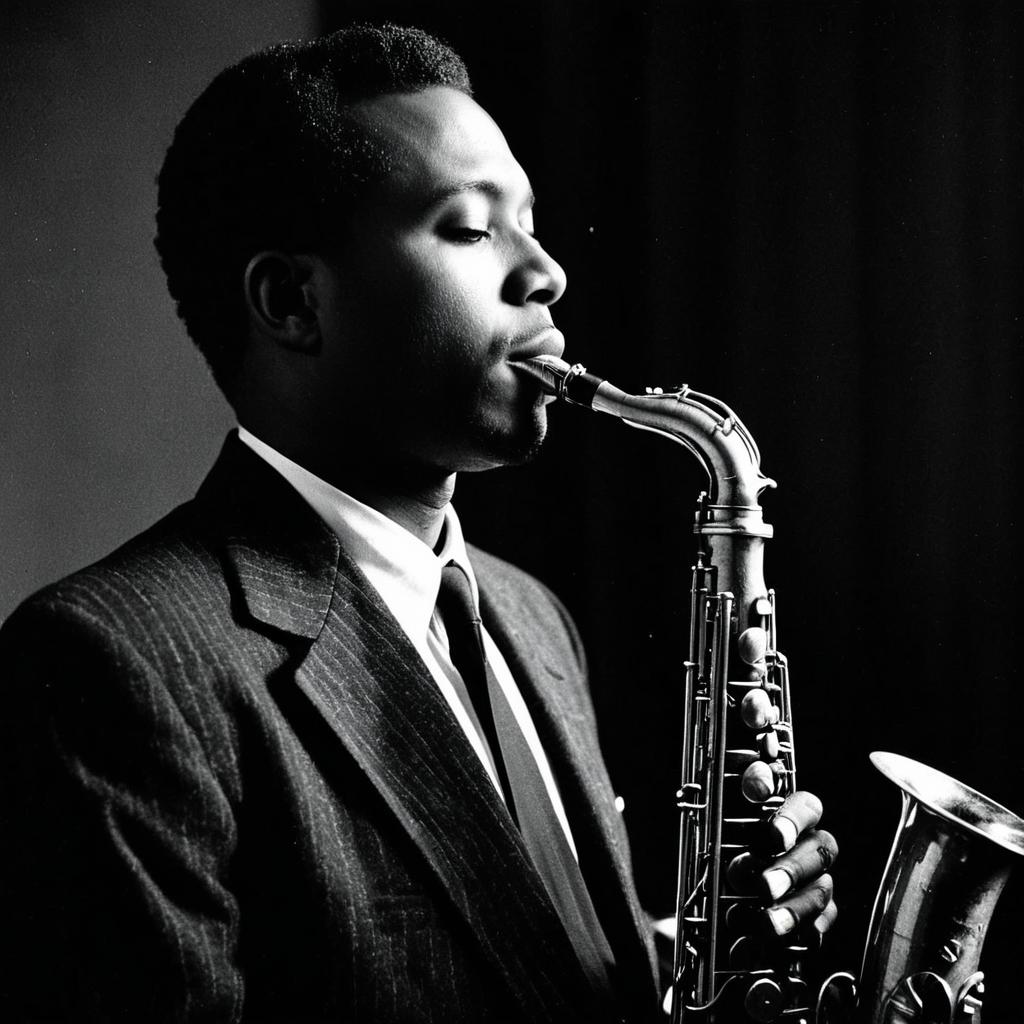 A dramatic portrait of a jazz saxophonist with eyes closed in soulful absorption, captured in 1940s noir photography with subtle film grain adding depth and authenticity,