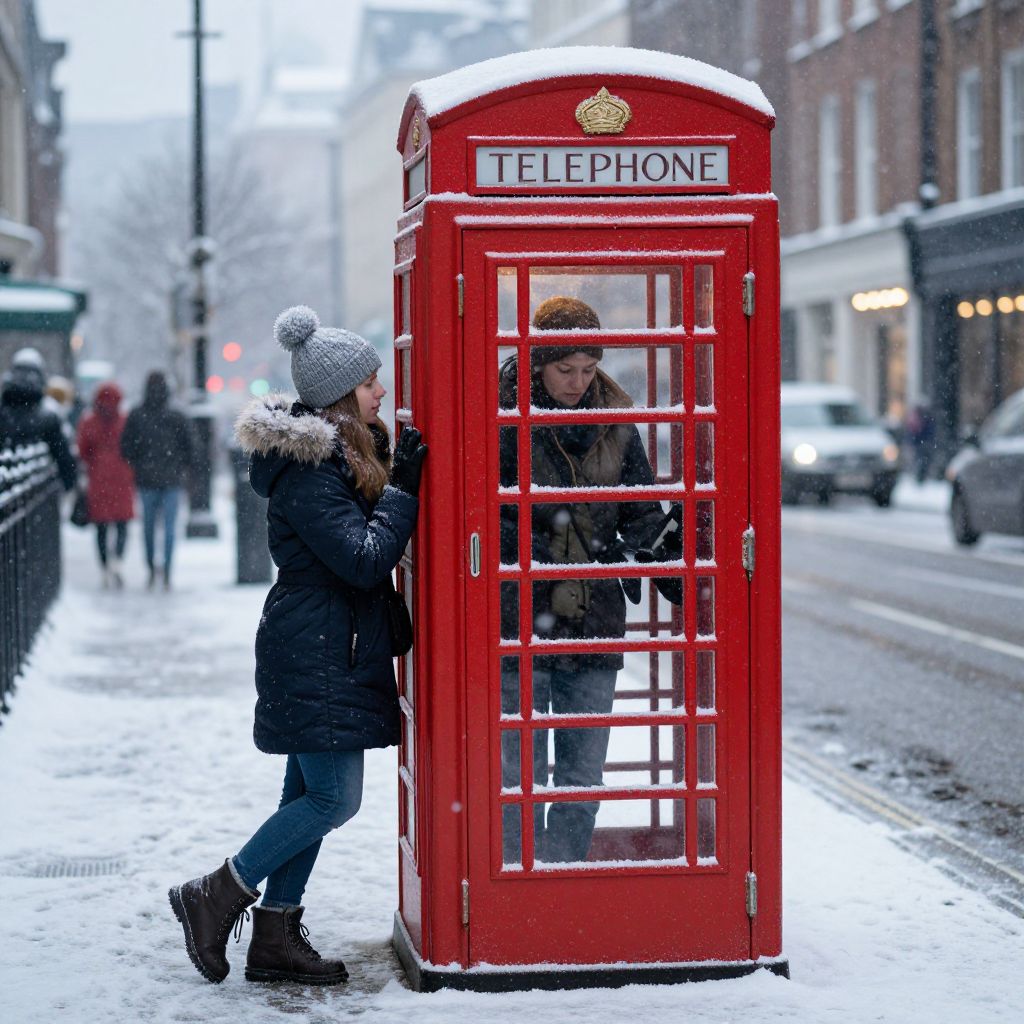 Snow-covered red telephone booth stands prominently on a snowy street, with a woman in a winter coat and hat leaning against it while another person is seen inside, both surrounded by falling snowflakes and blurred city lights in the background.