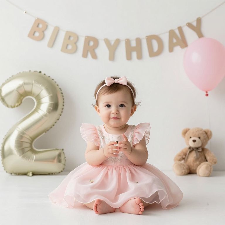 Photograph of a cute baby girl with fair skin and brown hair, wearing a pink dress with ruffled sleeves and a pink bow headband. She sits on a white floor, hands clasped, with a silver "2" balloon on the left and a pink balloon on the right. Behind her is a "BIRTHDAY" banner and a brown teddy bear. The background is bright and white, highlighting the celebratory theme. The baby's pink shoes match her dress, and the overall scene is cheerful and festive.