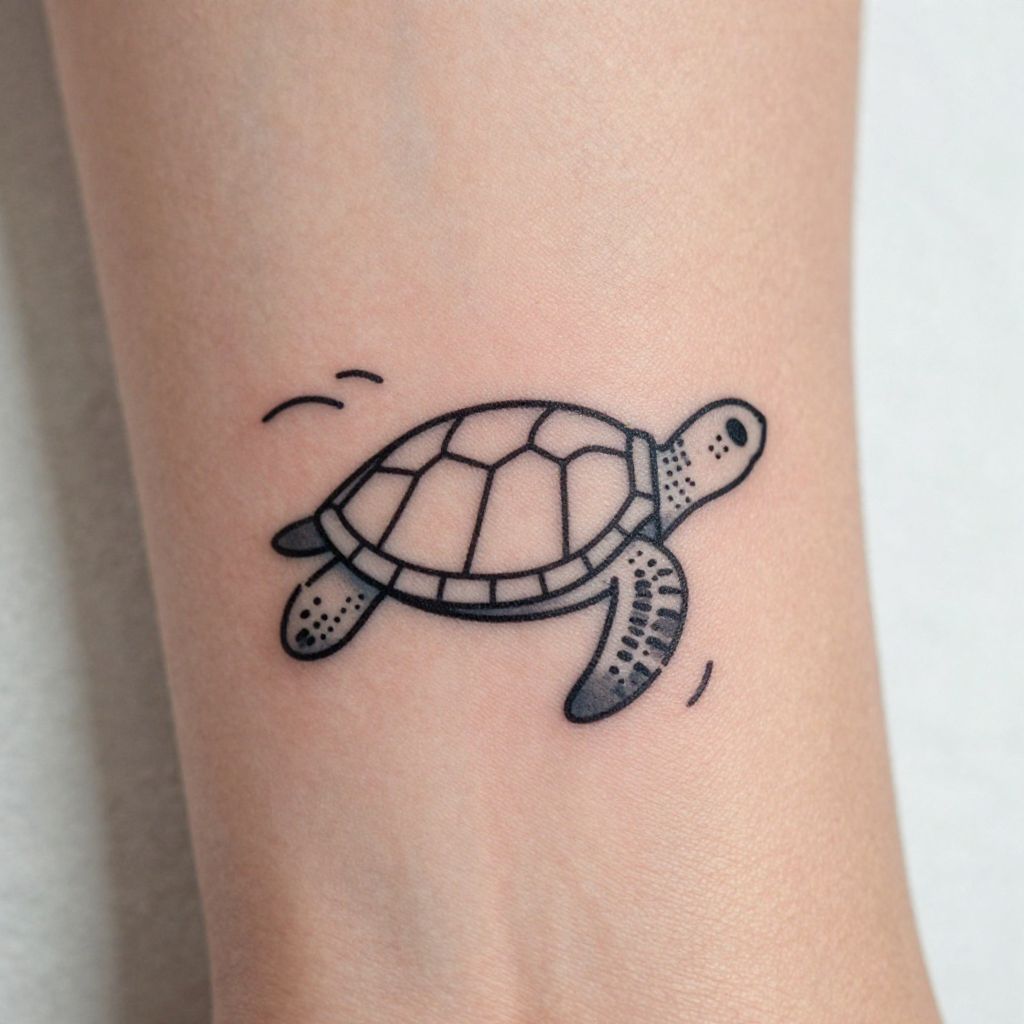 Minimalist swimming turtle tattoo, simple black ink with fine line details focusing on the gentle curves of the turtle shell and flippers, subtle wave motifs around, elegant and understated design suitable for wrist or ankle placement, emphasizing freedom and grace.
