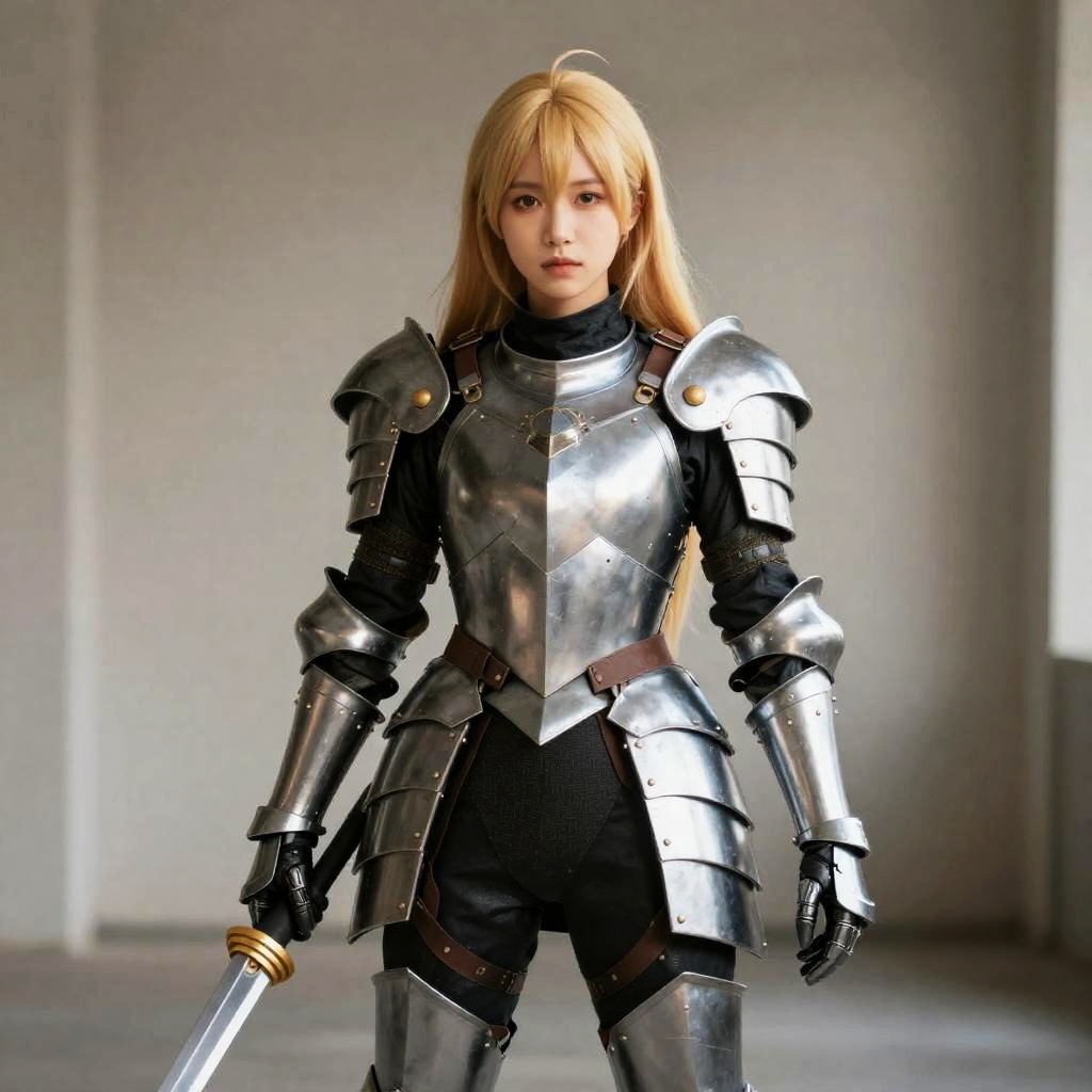 A young woman with shoulder-length layered waves with curtain bangs and deep chestnut brown standing outdoors in a park setting, wearing fantasy-style armor with metallic silver and gold shoulder plates, a sleek silver chest plate, and dark undergarments. Soft natural sunlight filters through trees, illuminating her detailed features. cleavage, big breasts, blurry background. The scene is rendered in a highly detailed digital painting style, showcasing sharp and realistic facial features with a slight blush on her cheeks, an elegant and confident pose, and a background filled with green foliage and a bright blue sky.