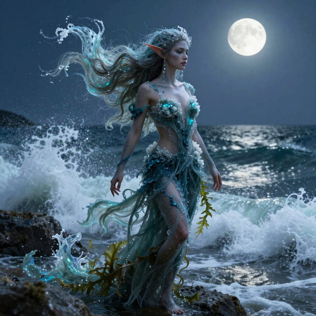 Female water genasi art, ethereal waterborne spirit with fluid, wave-like hair and crystalline water droplets, dressed in flowing garments resembling sea foam and kelp, standing on rocky shore beside crashing waves under moonlight, mystical atmosphere, vivid and textured digital artwork