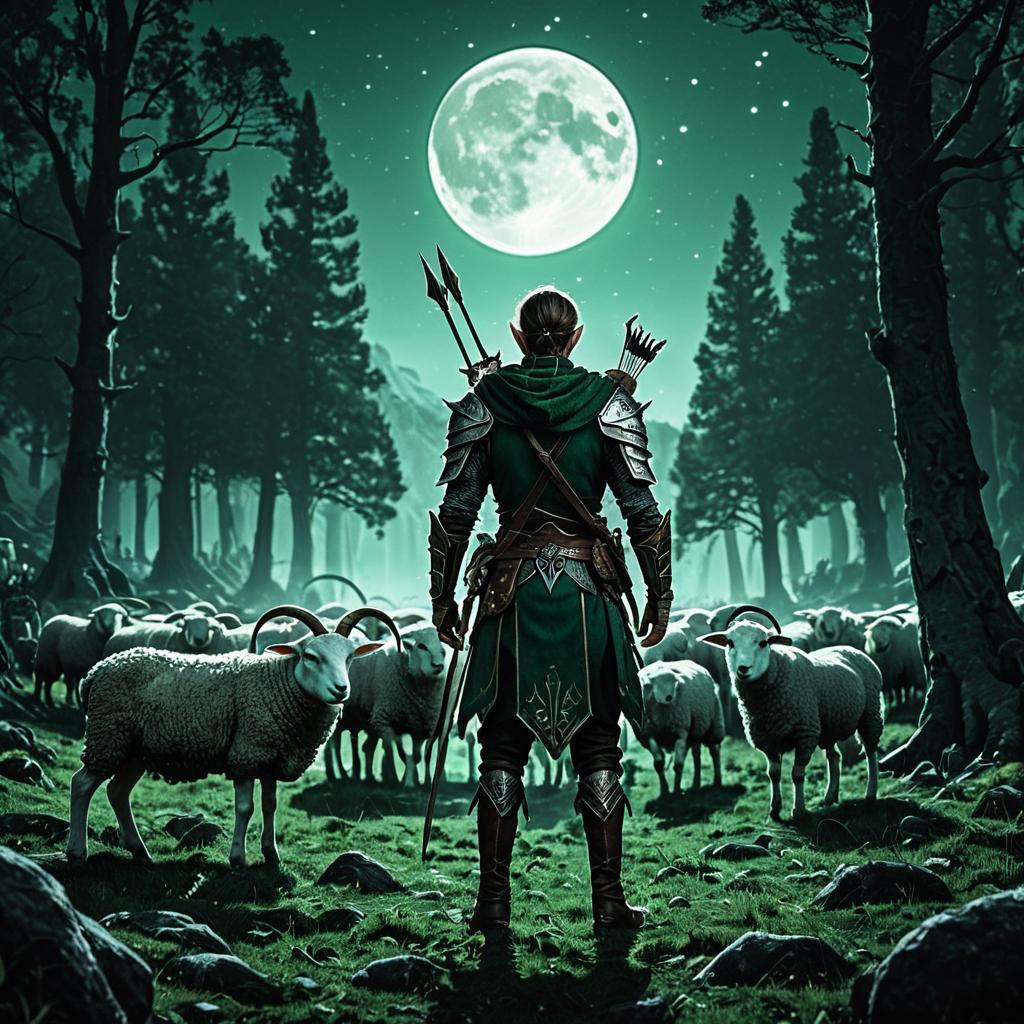 A ranger with his back to the audience, holding a magical staff and shooting at an army of goblins, attacking from both sides of the road. Background: a mystical forest, long shot, digital painting style, high-quality movie storyboard.