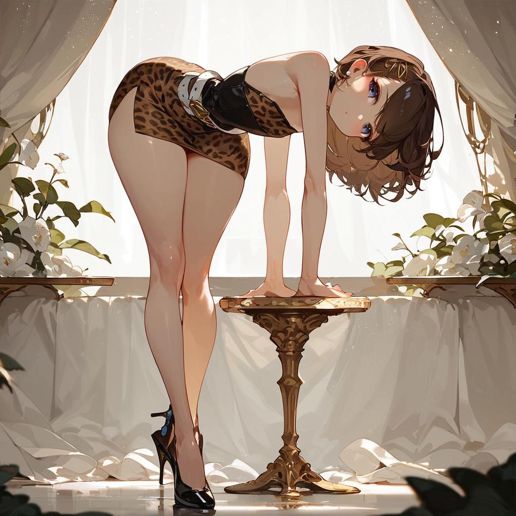 Digital artwork of a slender young woman with pale skin and short brunette hair, wearing a short strapless leopard print dress with a black belt and high heels. She is bending over a small ornate table in a softly lit indoor setting adorned with white flowers and light curtains.