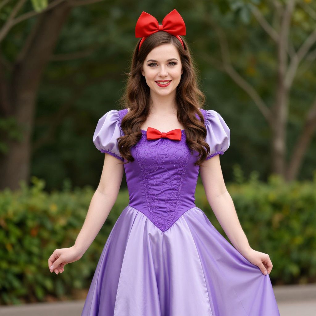 Photograph of a fair-skinned woman with long brown hair, wearing a purple and white Disney-inspired dress with red bow, red bowtie, and