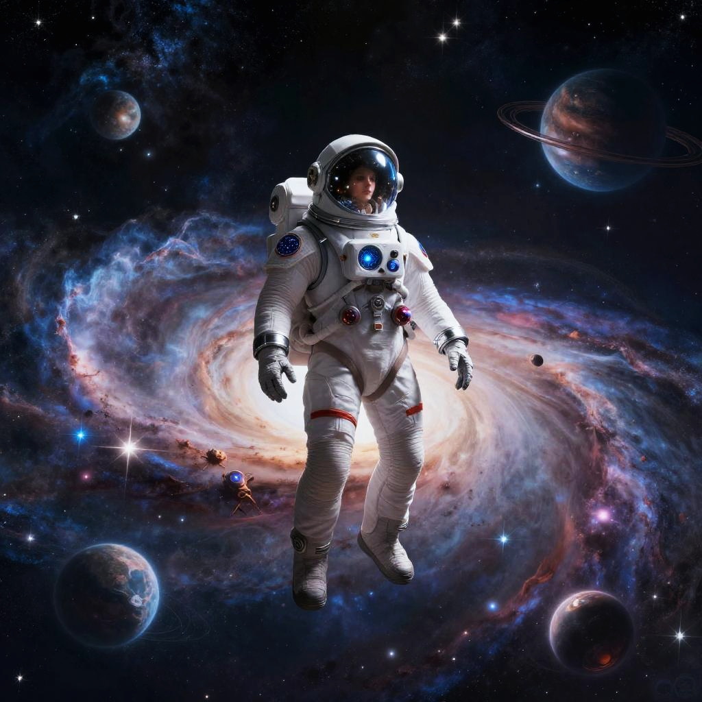 Goingmary cosmic traveler, GoingMary floating through a star-studded galaxy with swirling nebulas and distant planets, wearing a sleek space suit, glowing celestial elements, vastness and mystery of deep space