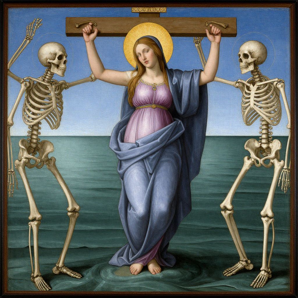 Digital artwork of a pregnant Mary with a halo, crucified between two skeletal figures, arms outstretched, by a wooden cross. Blue ocean background