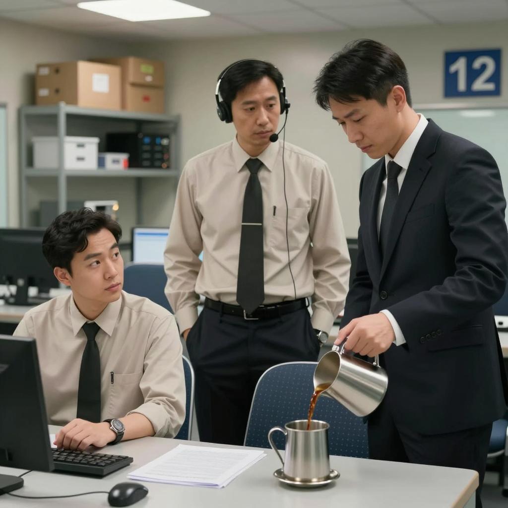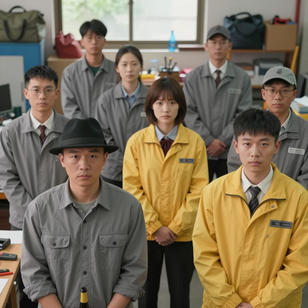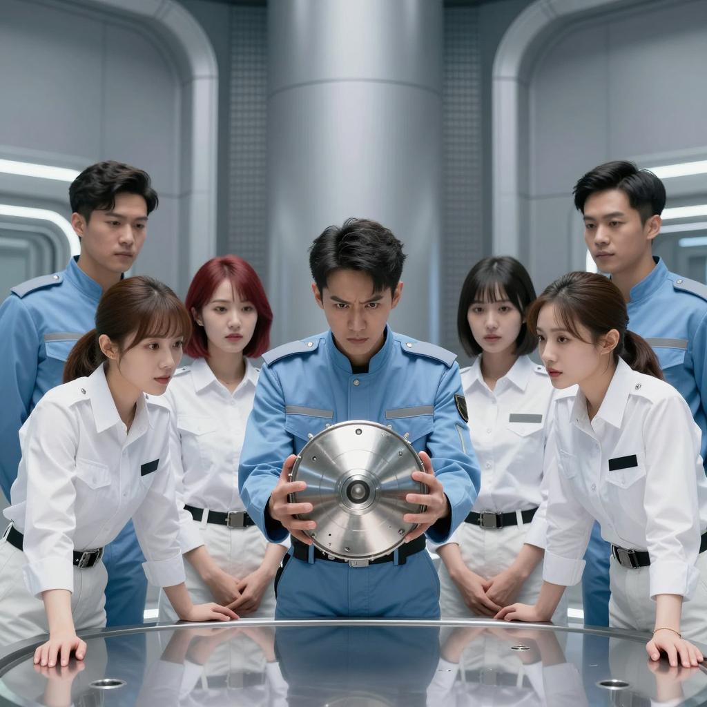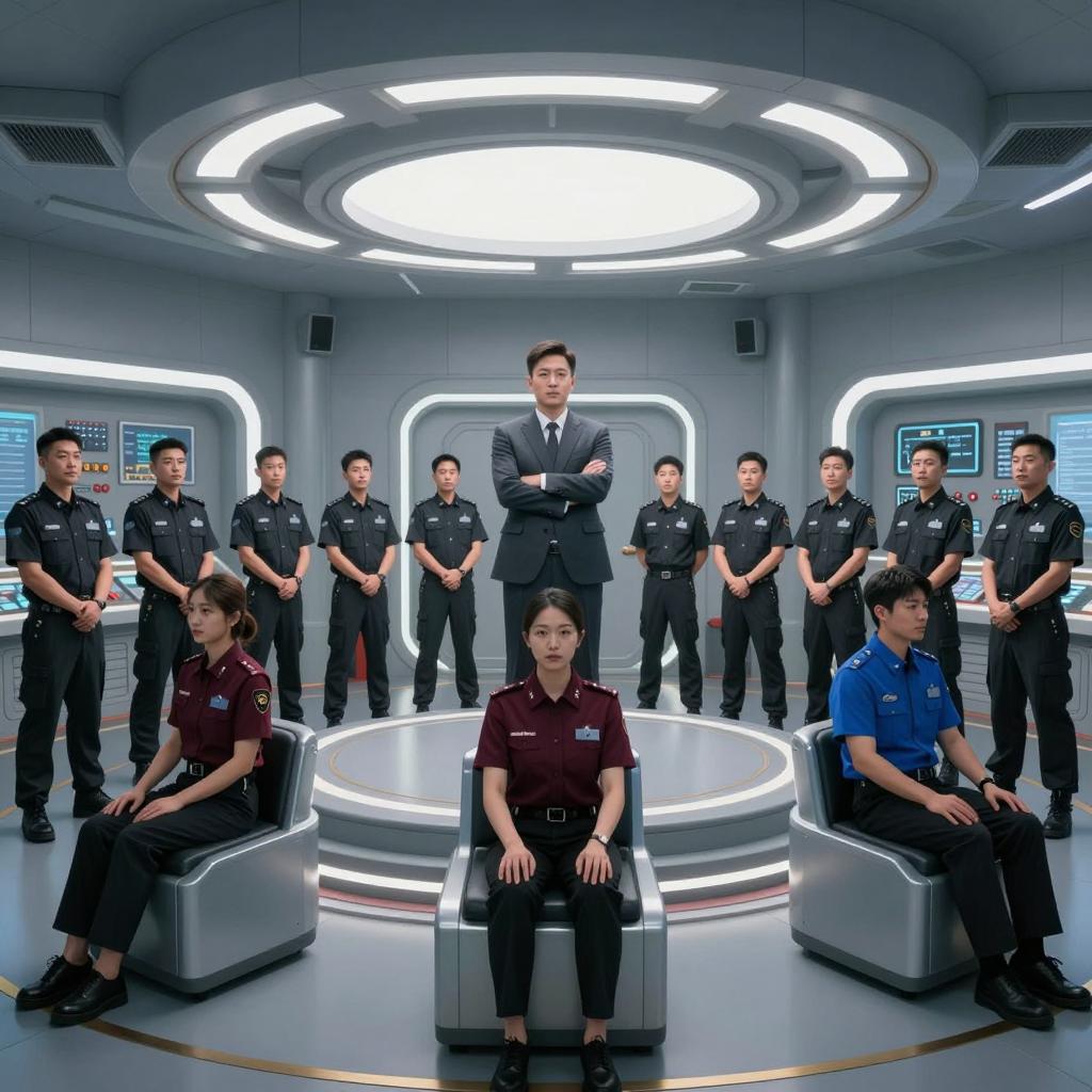 Group of 22 men in black uniforms standing and sitting in a futuristic, circular control room with metallic surfaces. Central figure in gray suit stands on circular platform, arms crossed. Three people in front, two women and one man, in maroon and blue shirts, seated in metallic pods. Overhead lighting in circular patterns. Background includes more uniformed men and control panels.