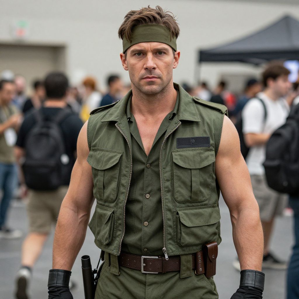 A man dressed in a detailed Rambo: First Blood costume poses candidly at a cosplay festival, showcasing the iconic military green vest, headband, and muscular build. The background captures a bustling indoor event with other attendees blurred out, emphasizing the subject's striking cosplay style.