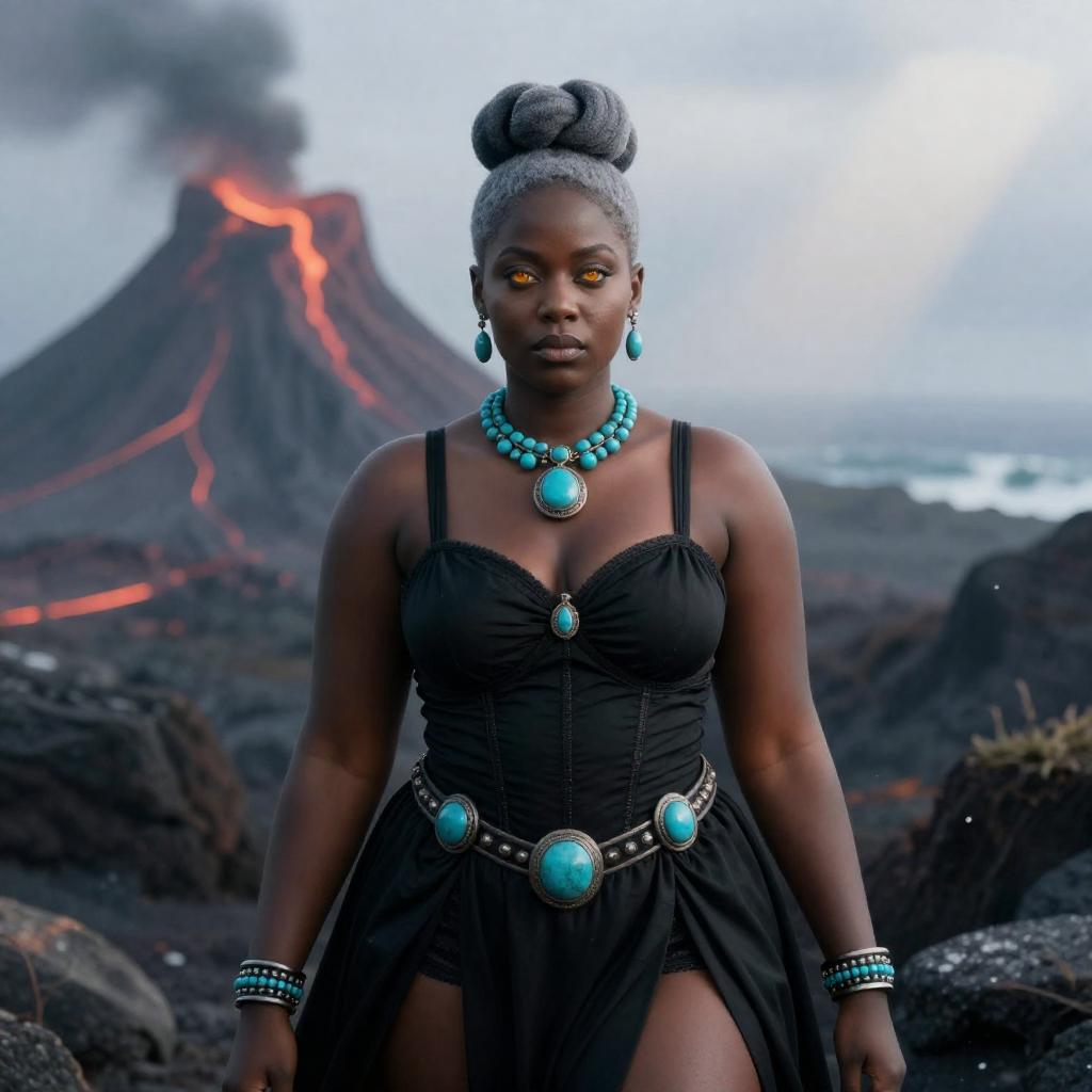 Portrait of a mature Senegalese woman with flat breasts and a very short grey doughnut bun hairstyle, standing in front of an erupting volcano. She wears a black morning dress adorned with turquoise jewelry and armored dress accents. Her eyes glow light orange with a serene expression. The scene features a striking psychedelic winter ambiance with a volcanic and temperate ocean background, enhanced by god rays, cinematic hard lighting, and bokeh effects.