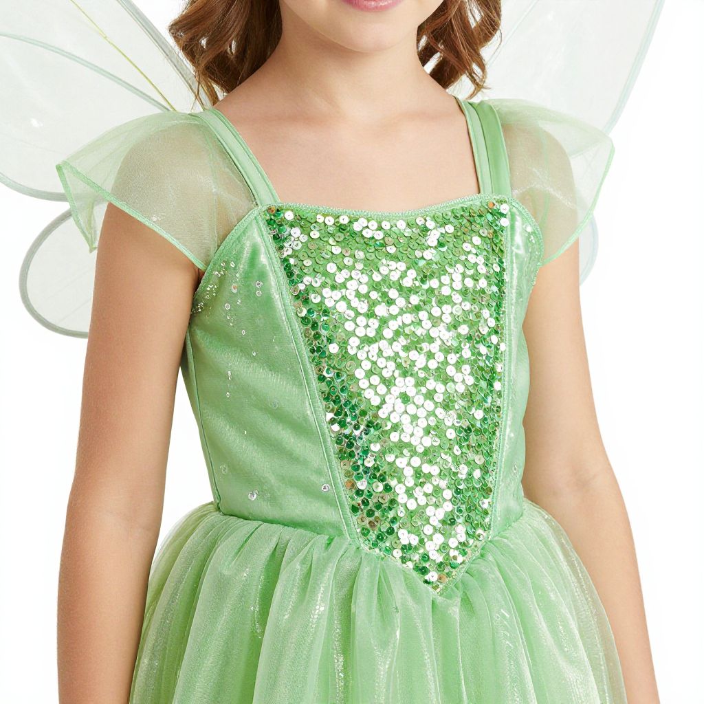 Sequin Tinkerbell Costume, a close up of a young girl wearing a green dress and a fairy costume