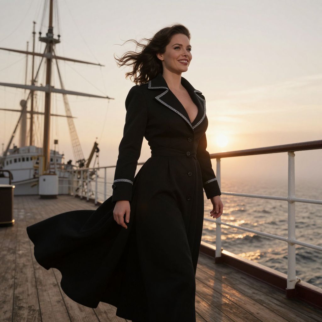 A cinematic photo of a woman in a 1930s-inspired ship deck costume — a long, flowing long coat in black with silver edging and a high collar — standing on the deck of an old-time ocean liner, wind blowing her hair and coat dramatically; she has a strong jawline, high cheekbones, and a bright, confident smile, her face illuminated by the warm glow of a setting sun; the setting includes a vintage ship with tall masts, fog rolling in gently, and the sea shimmering in the evening light.. The woman has big tits and cute face