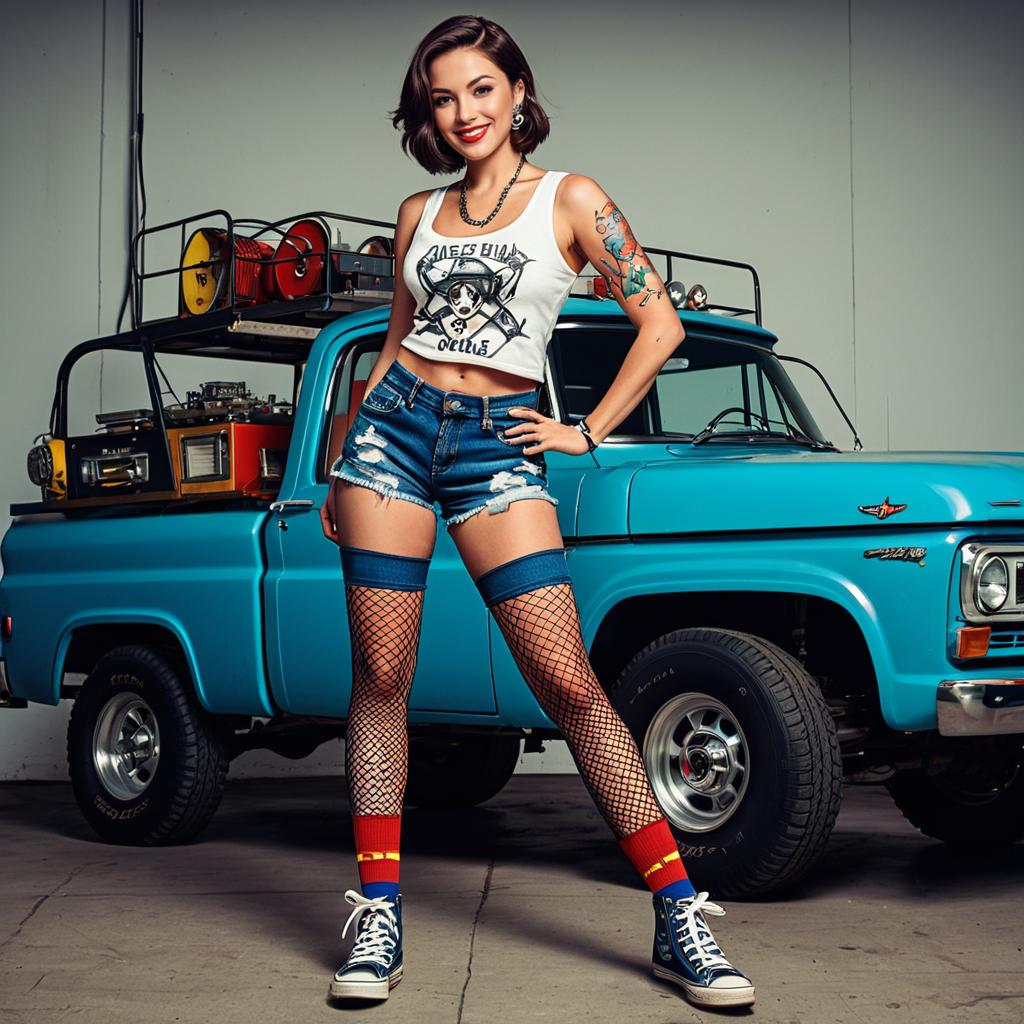 (2D cartoon illustration) of a modern fashionista, standing confidently by a rugged 2000s Speed star rig, (medium length wavy chestnut hair), adorned with vibrant tattoos, (off-shoulder crop top) and (high-waist trousers), wearing alluring fishnet stockings, cheerful and upbeat ambiance, bold colors, dynamic composition, capturing a lively working girl vibe, ready for a stylish T-shirt design.