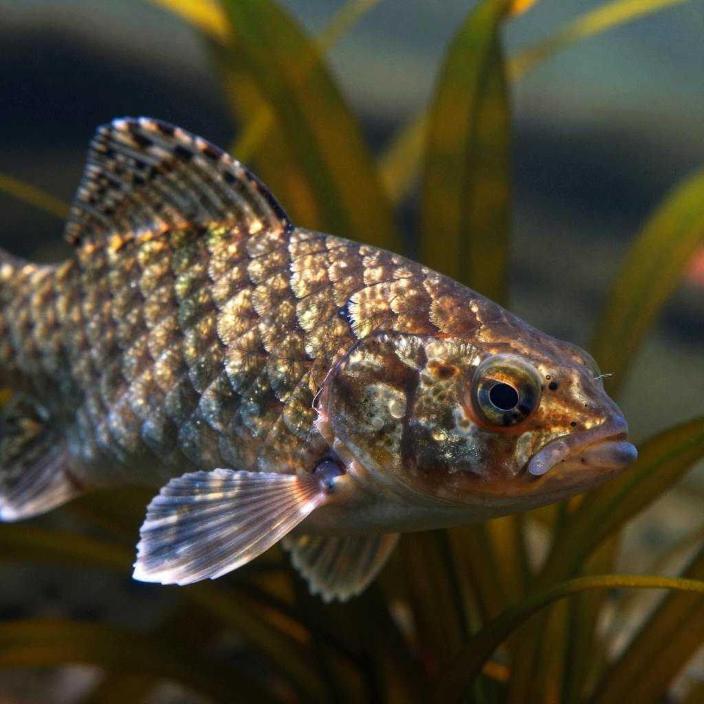 Close-up of a hecht underwater, extremely detailed scales glistening, surrounded by floating aquatic plants, blurred water background, soft natural lighting highlighting texture and natural colors, artistic realism with photographic sharpness.