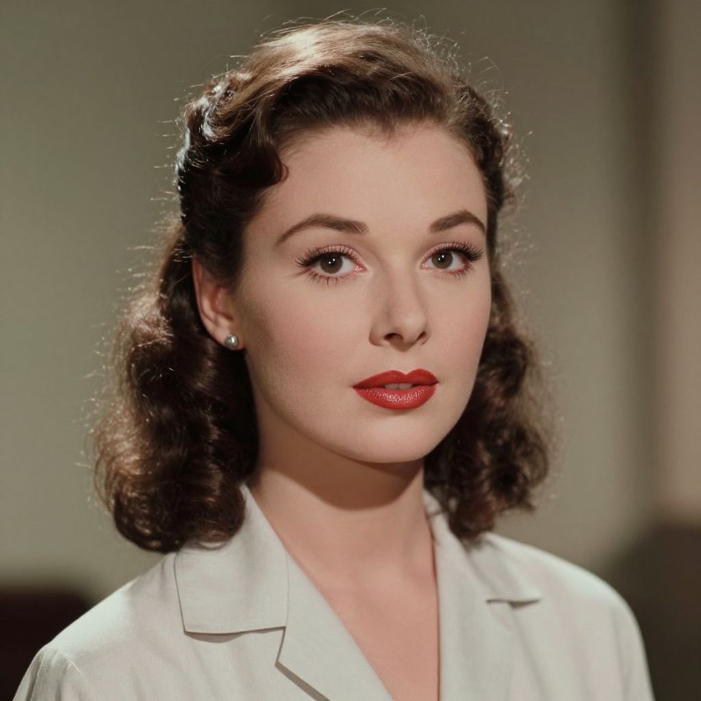 A vintage-inspired portrait featuring a woman with classic Hollywood glamour, styled in a retro aesthetic with soft, natural lighting and a timeless elegance reminiscent of mid-20th-century cinema.
