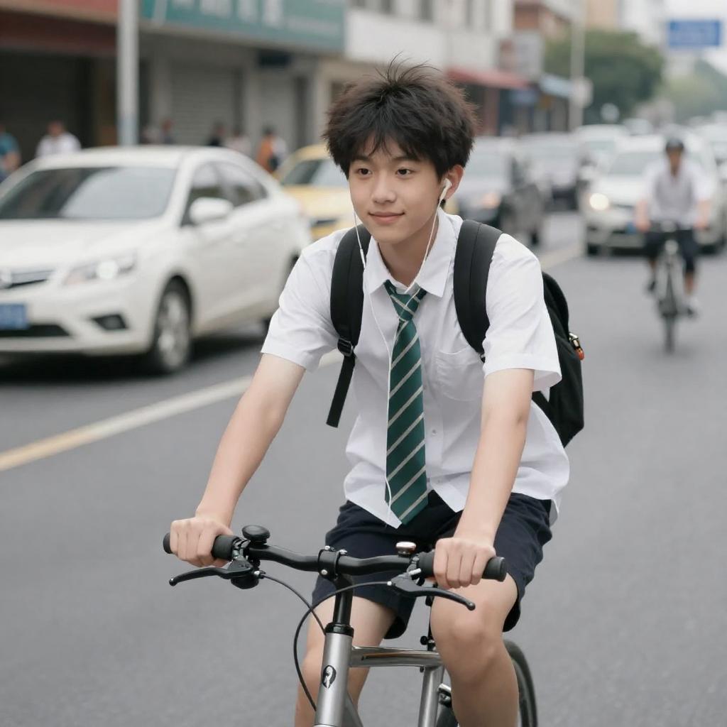 Teenage boy with short dark hair, white shirt, green striped tie, black backpack, and white earphones, smiling, riding a bicycle on a city street. Cars and pedestrians in the background. Urban setting, daytime, overcast light.