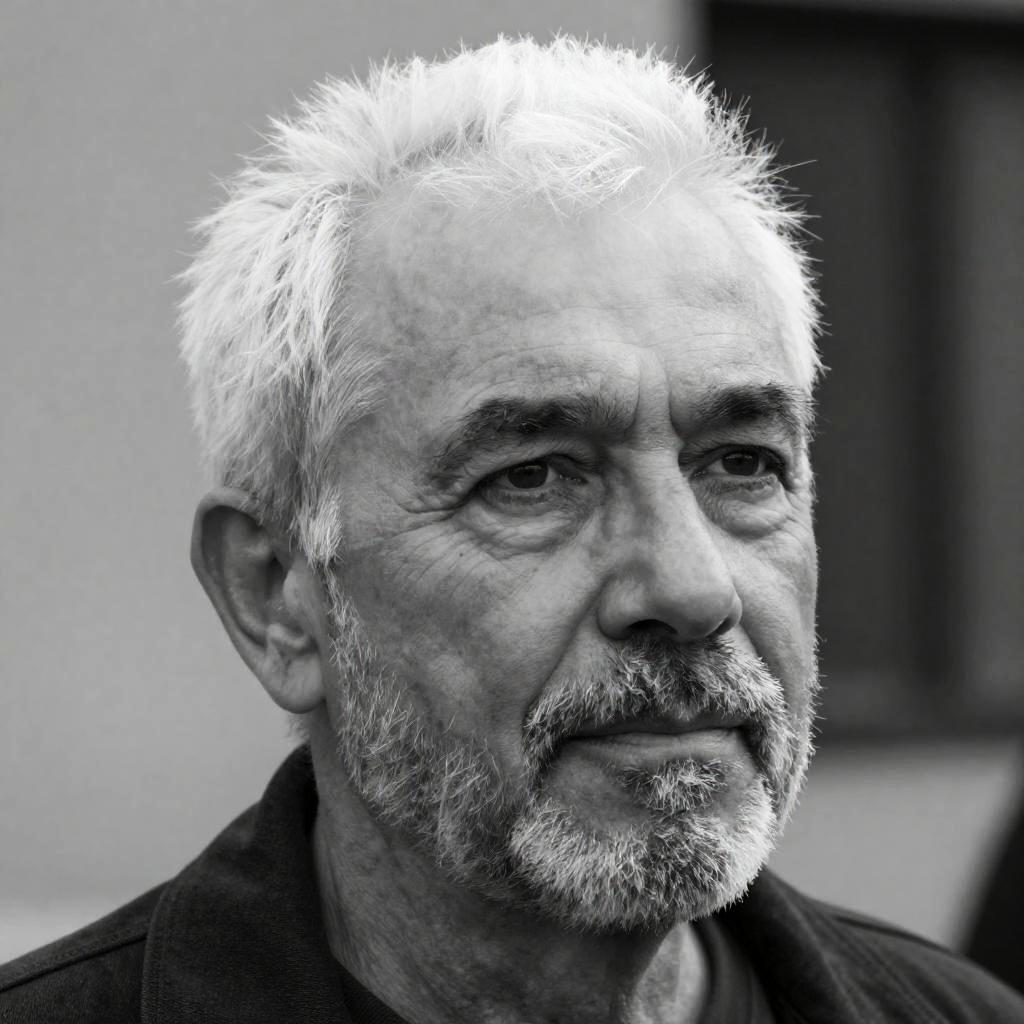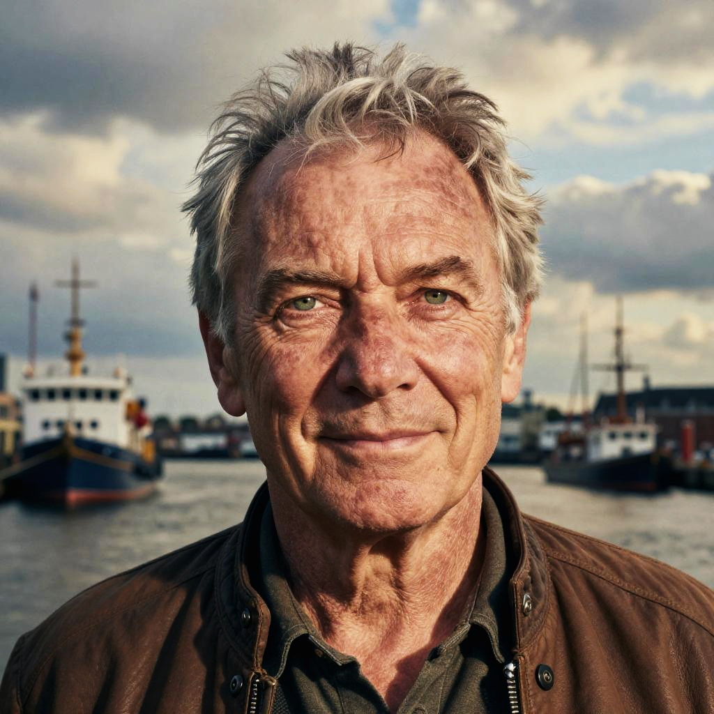 RAW photo, 8k UHD, high detailed skin, handsome german hippie, (72 year old), bavarian man, green eyes, rule of thirds, masterpiece, photography, ultra realism, realistic, outdoors, golden hour, portrait, smiling, grey short hair, rocker style, DoF, (Hamburg:1.1), harbor, sky, clouds, soft lighting, ( highly detailed skin:0.7), (film grain:1.1), 8k uhd, dslr, high quality, Fujifilm XT3