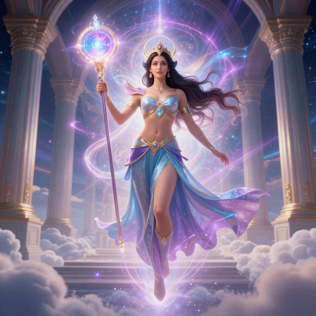 Digital artwork of a radiant, silver, winged female statue standing on a cloud-covered, futuristic, dome-topped structure against a bright blue sky.