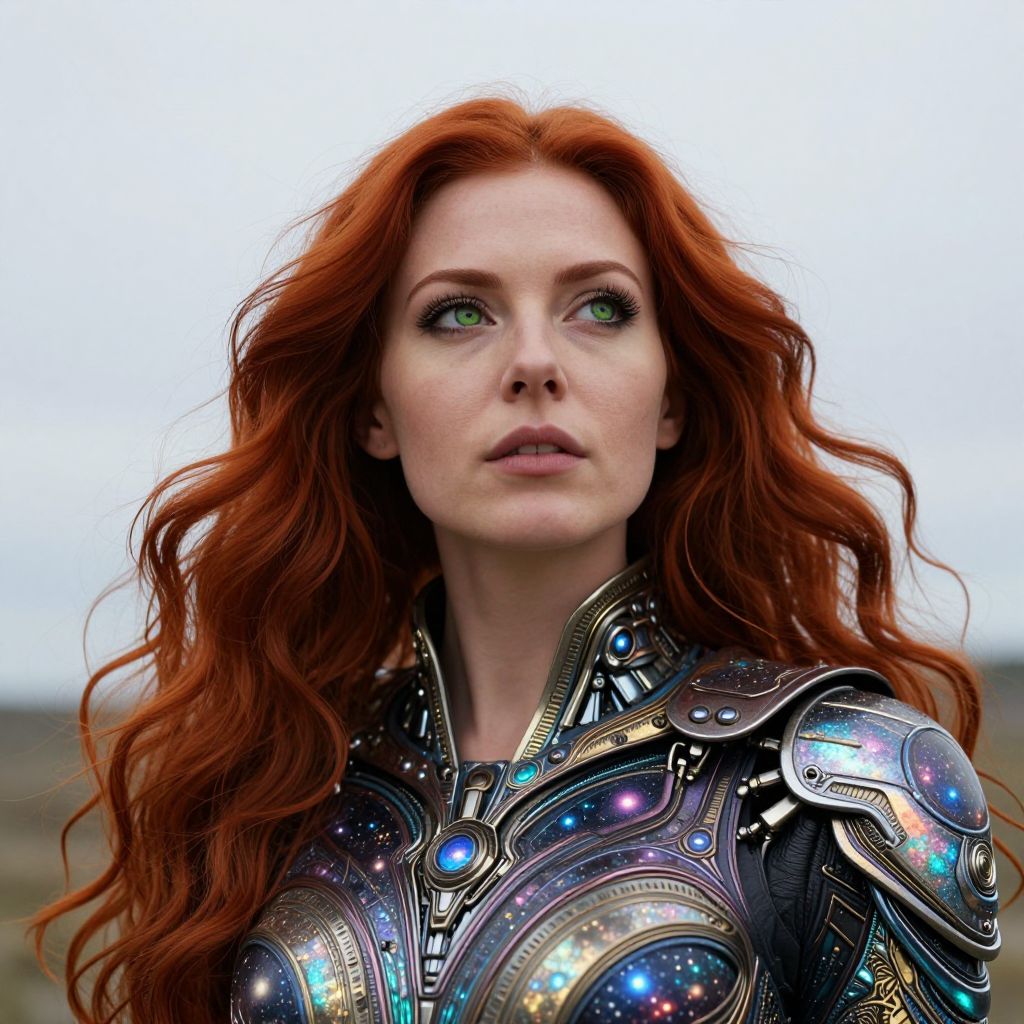 Photorealistic digital artwork of a fair-skinned woman with long, wavy red hair and striking green eyes. She wears an intricate, futuristic armor with glowing blue and white accents, resembling a sci-fi or fantasy suit. The armor is detailed with swirling patterns and embedded lights, giving it a cosmic appearance. She gazes upward with a focused, slightly intense expression. The background is a blurred, overcast sky, emphasizing her as the central figure. The overall style blends realistic human features with fantastical, high-tech elements.