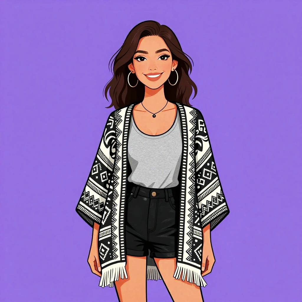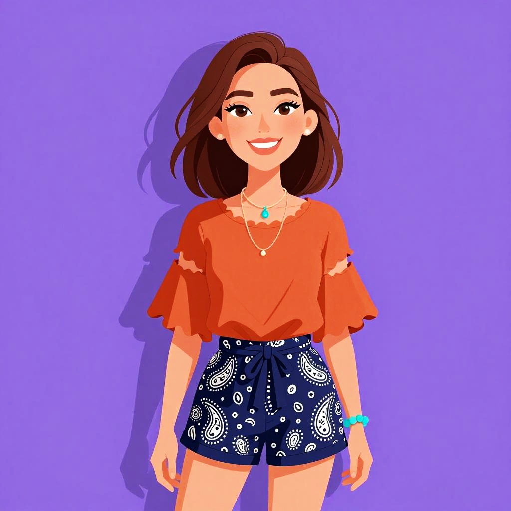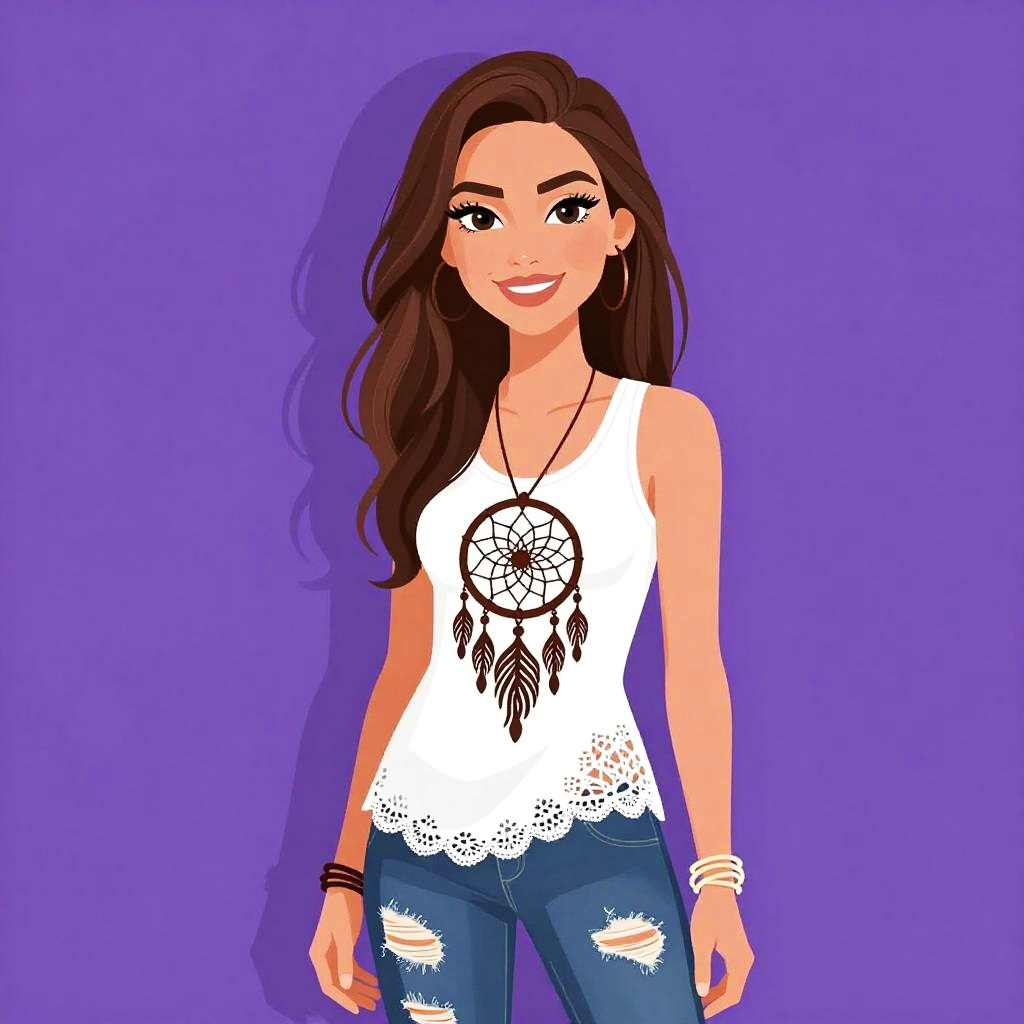Woman with pretty face and pretty hair. Woman, bohemian, loose-fitting cream top with blue paisley and peacock patterns, draped short sleeves, scoop neckline, semi-sheer fabric, blue skinny jeans, feather pendant necklace, thin bangle on wrist. --sref 1467