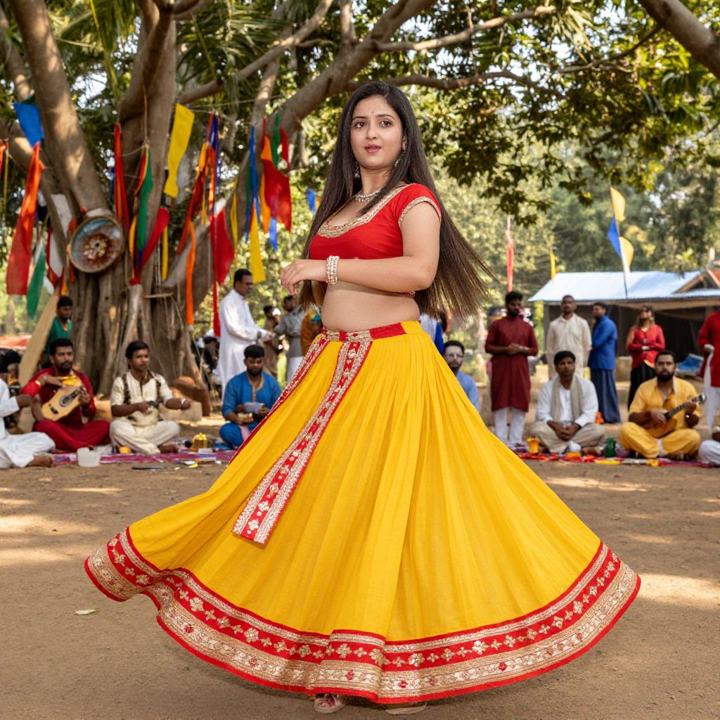 Photograph of a young South Asian woman with long, straight black hair, wearing a red crop top and a yellow lehenga with red and gold trim. She stands in a festive outdoor setting, surrounded by colorful flags and trees. Her hands are clasped in front of her, and she wears a gold bracelet. In the background, people sit and stand, some playing instruments, creating a lively atmosphere. The ground is dusty, and sunlight filters through the trees, casting shadows. The woman's expression is focused and confident.