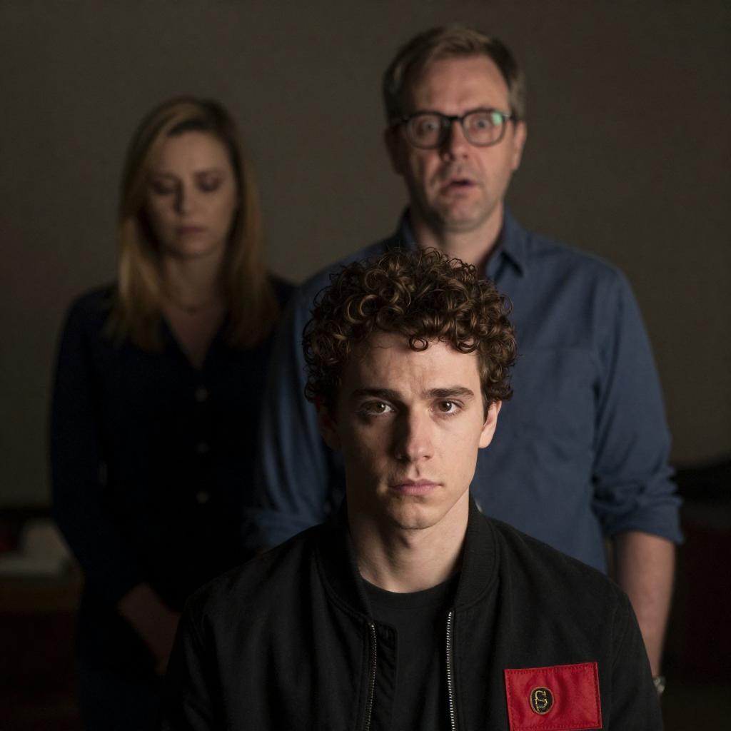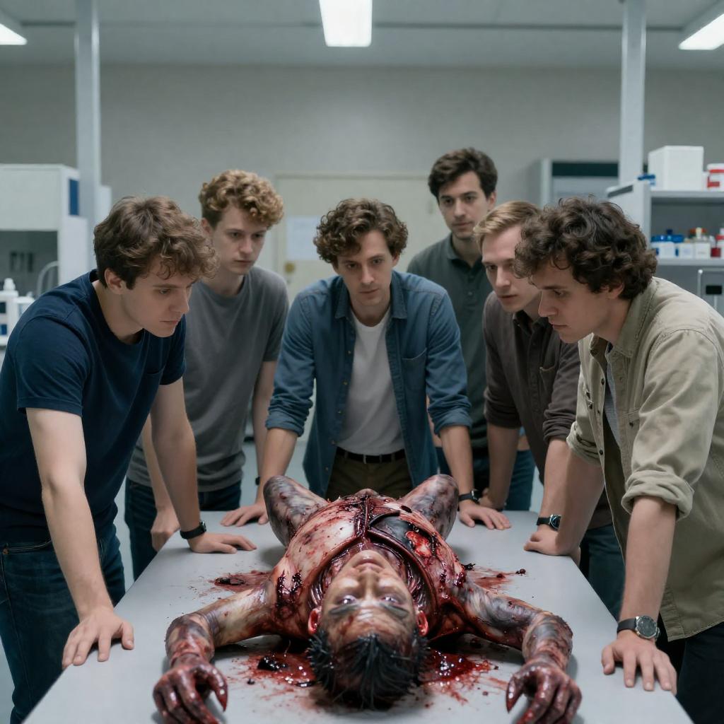 Six men in a laboratory, surrounding a large, bloody, partially dissected creature on a table. Men have varied hair colors and styles, wearing casual and work attire. Laboratory equipment and shelves in the background. Men's expressions range from focused to curious. Laboratory setting with industrial lighting.
