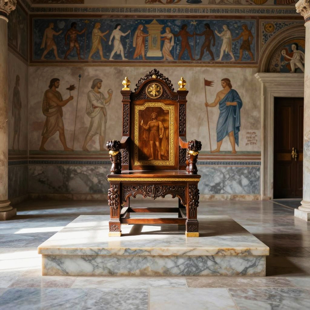 Ancient Greek throne room illuminated by natural light, featuring a raised marble dais, an intricately carved wooden throne with gold accents, frescoed walls illustrating mythology, and polished stone floors
