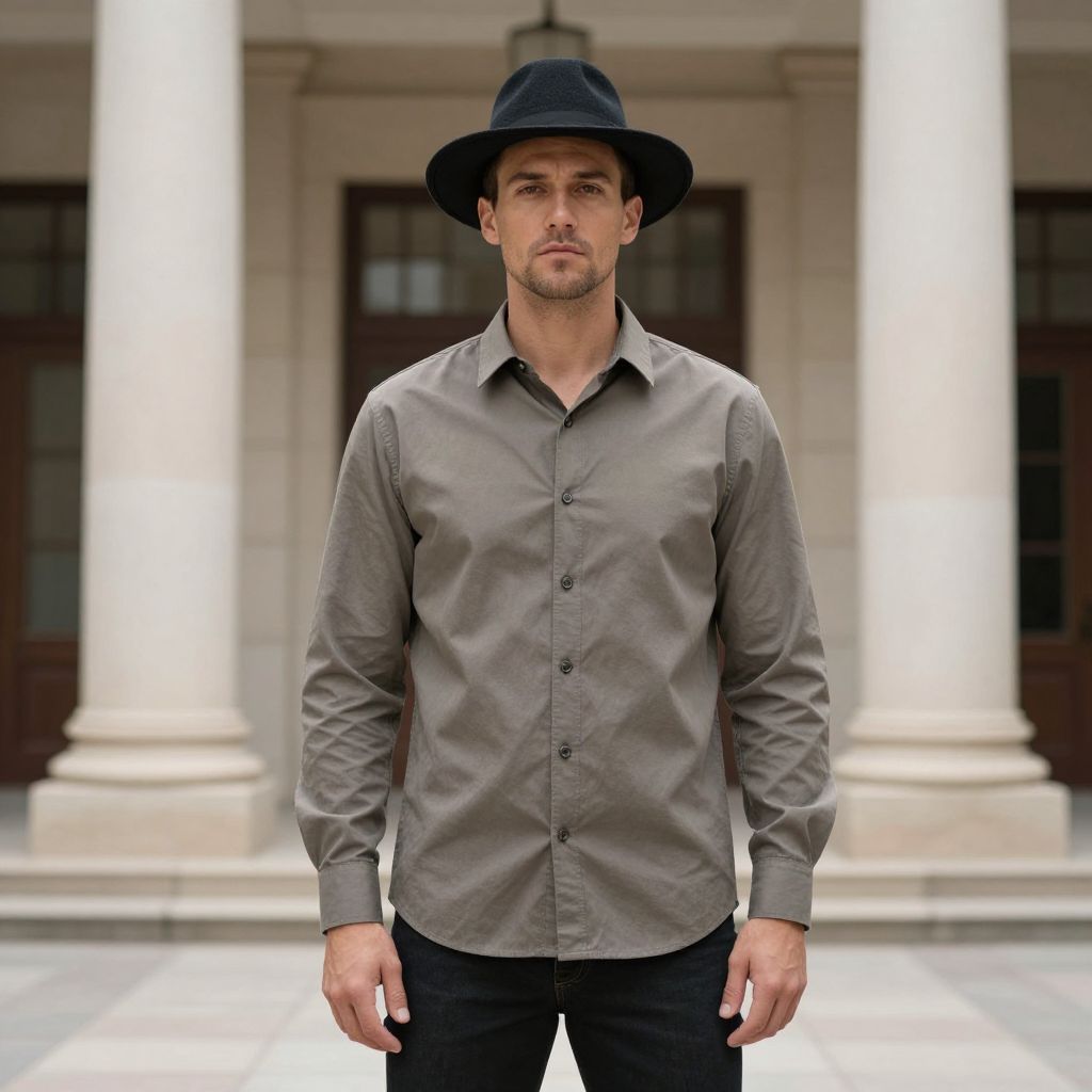 Photograph of a serious-looking, light-skinned man with short dark hair, wearing a black wide-brimmed hat and a gray, long-sleeved button-up shirt with a subtle diamond quilted pattern. He stands in front of two white columns with a beige building background and dark wooden doors. He is also wearing black pants. The lighting is bright, highlighting the texture of his shirt and the smoothness of the columns. The man's stance is relaxed, with arms slightly away from his body. The overall style is modern and slightly formal.