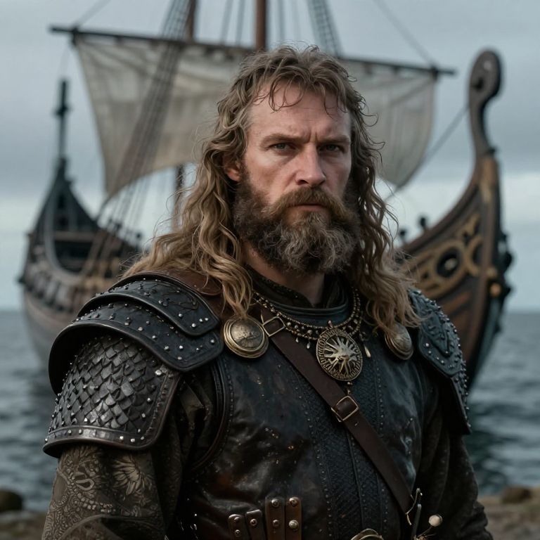 Photograph of a rugged, bearded Viking warrior with long, wavy hair, wearing dark, ornate armor, standing in front of a historic