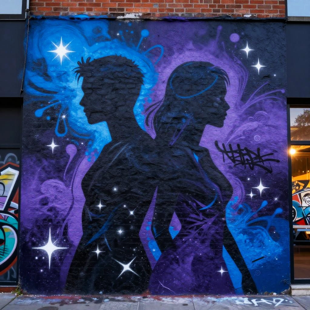 Gemini graffiti featuring twin celestial figures bursting from colorful urban mural, intricate line work, starry night background, glowing outlines, expressive and energetic street style.