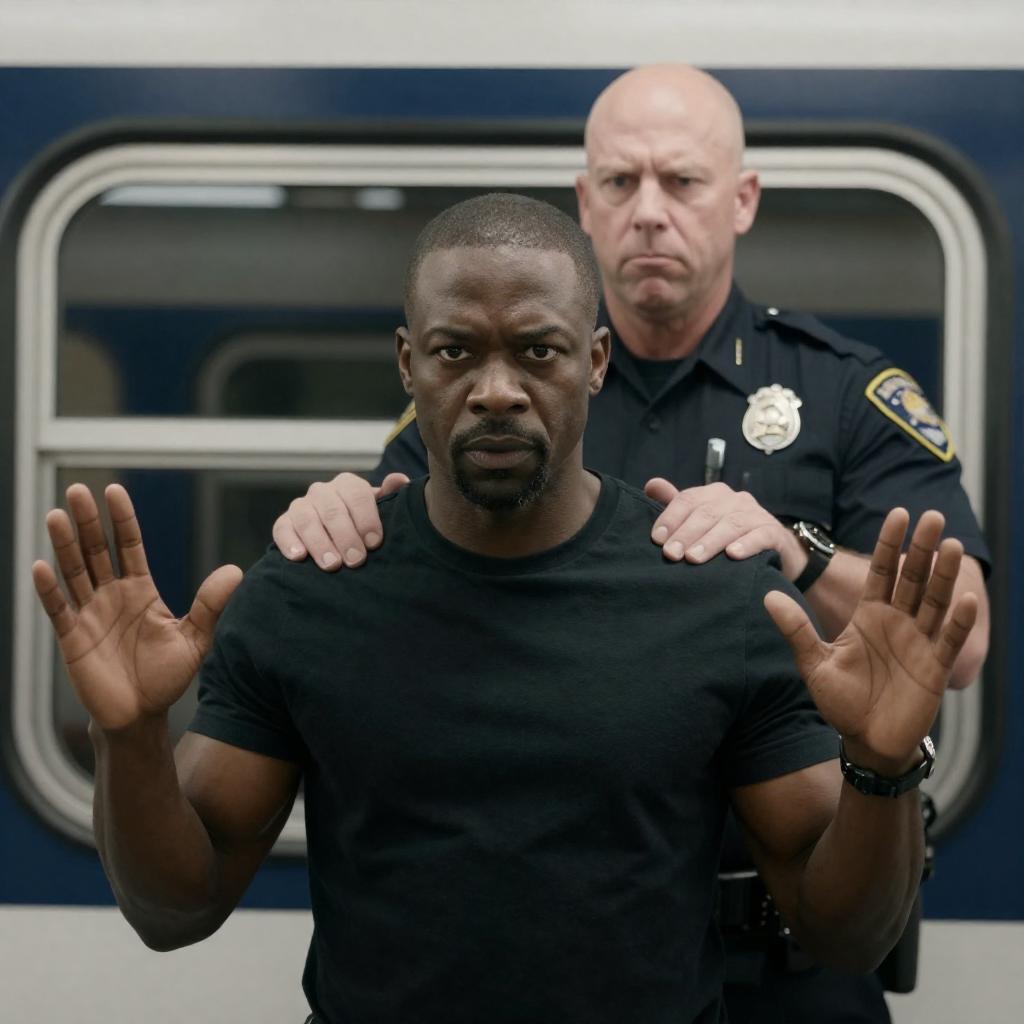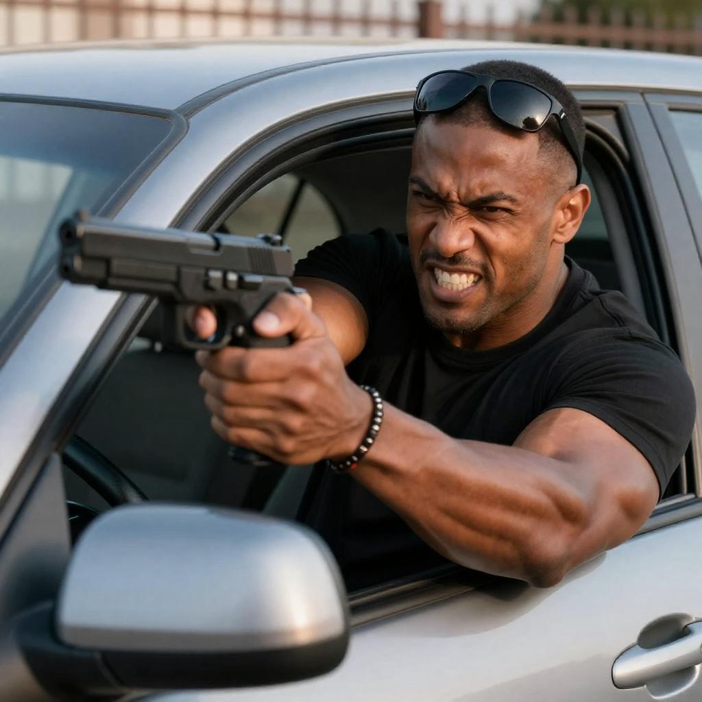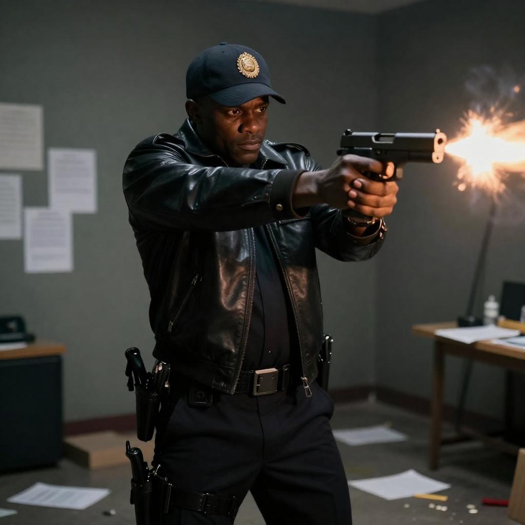 Photograph of a serious-looking Black man with short hair, wearing a black jacket, aiming a rifle with intense focus. Background is blurred blue and purple with flying confetti-like shapes. Two silver bullets in foreground, one pointing forward. Man's right arm extended forward, index finger on trigger.