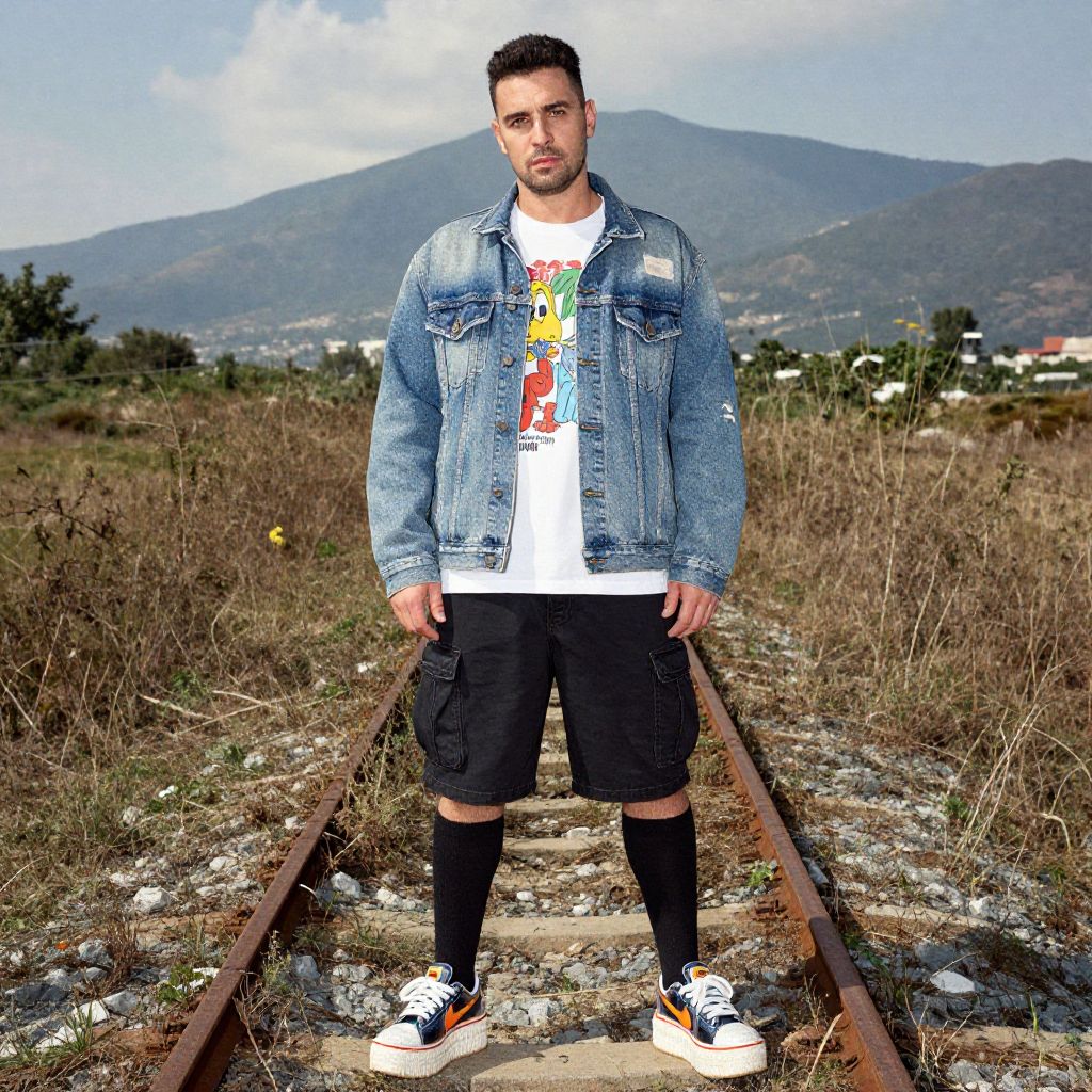 A man, faded oversized denim jacket, graphic long-sleeve shirt, black cargo shorts, knee-high socks, platform sneakers with bold prints, rusty tracks glinting in the sun, overgrown weeds, distant mountains looming, hand-tinted photograph, relaxed expression. Man has masculine face and piercing eyes