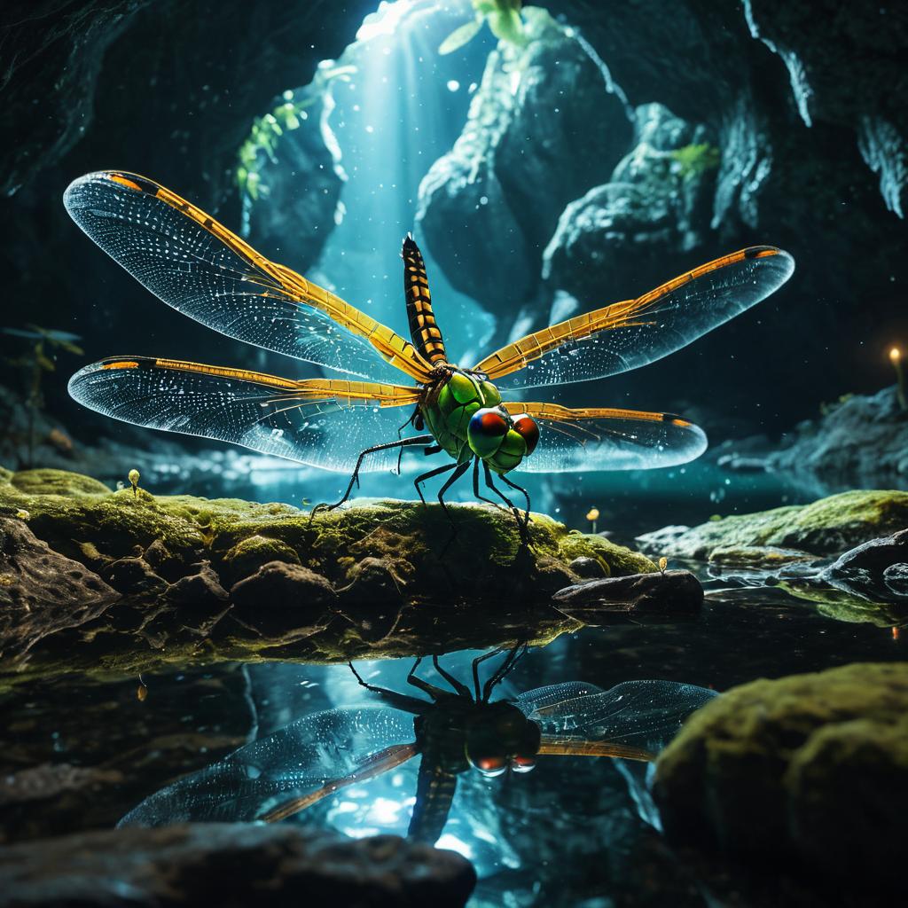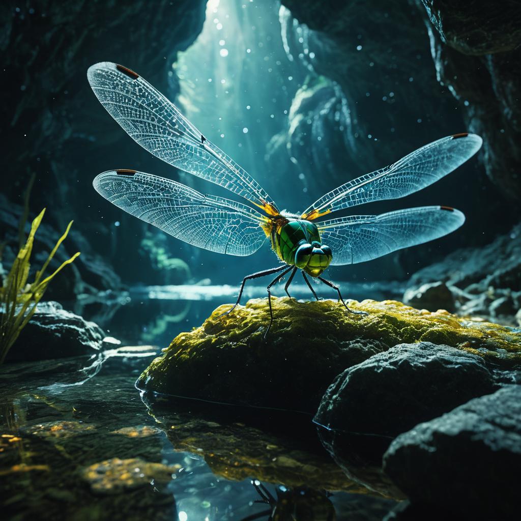A glowing crystalline dragonfly-amphibian hybrid emerges from the ancient translucent cave lake, envisioned in the style of Hayao Miyazaki and Ernst Haeckel, captured with a macro lens, shallow depth of field, ultra-detailed digital painting, cinematic lighting, photorealistic, epic Octane render.