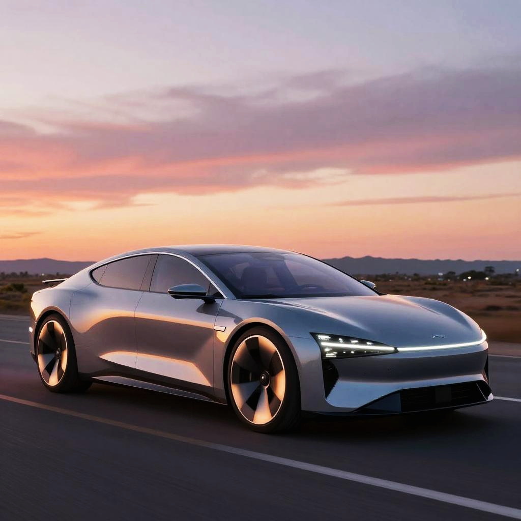 AI car design generator free tool showcasing next-gen electric car, minimalistic yet aggressive design, eco-friendly vibe, seamless glass panels, glowing wheels, vibrant sunset in background, hyper realistic digital painting with fine textures