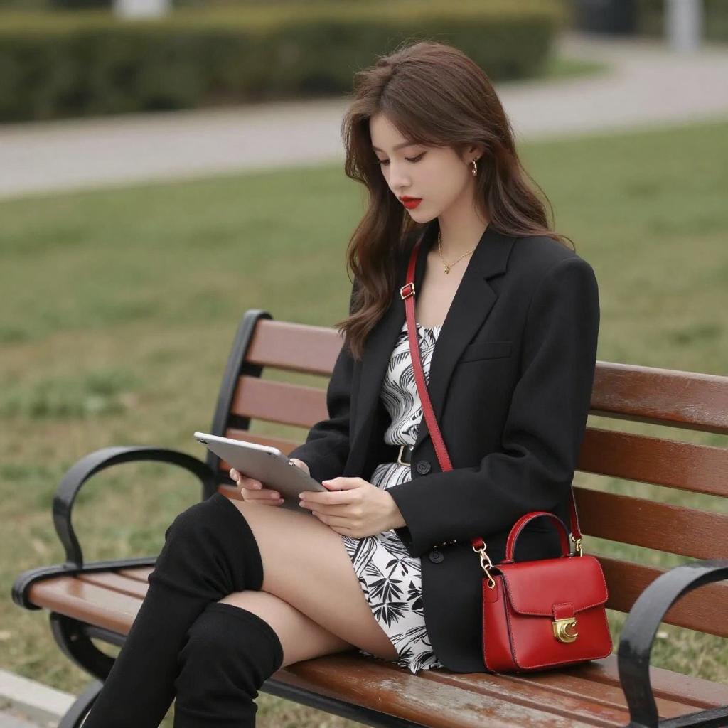 Photograph of a young woman with long brown hair, fair skin, and red lipstick, sitting on a wooden bench in a park. She wears a black blazer, white and black patterned dress, black thigh-high boots, and a red crossbody purse. She looks down at a tablet in her lap, with a blurred green hedge and pathway in the background.