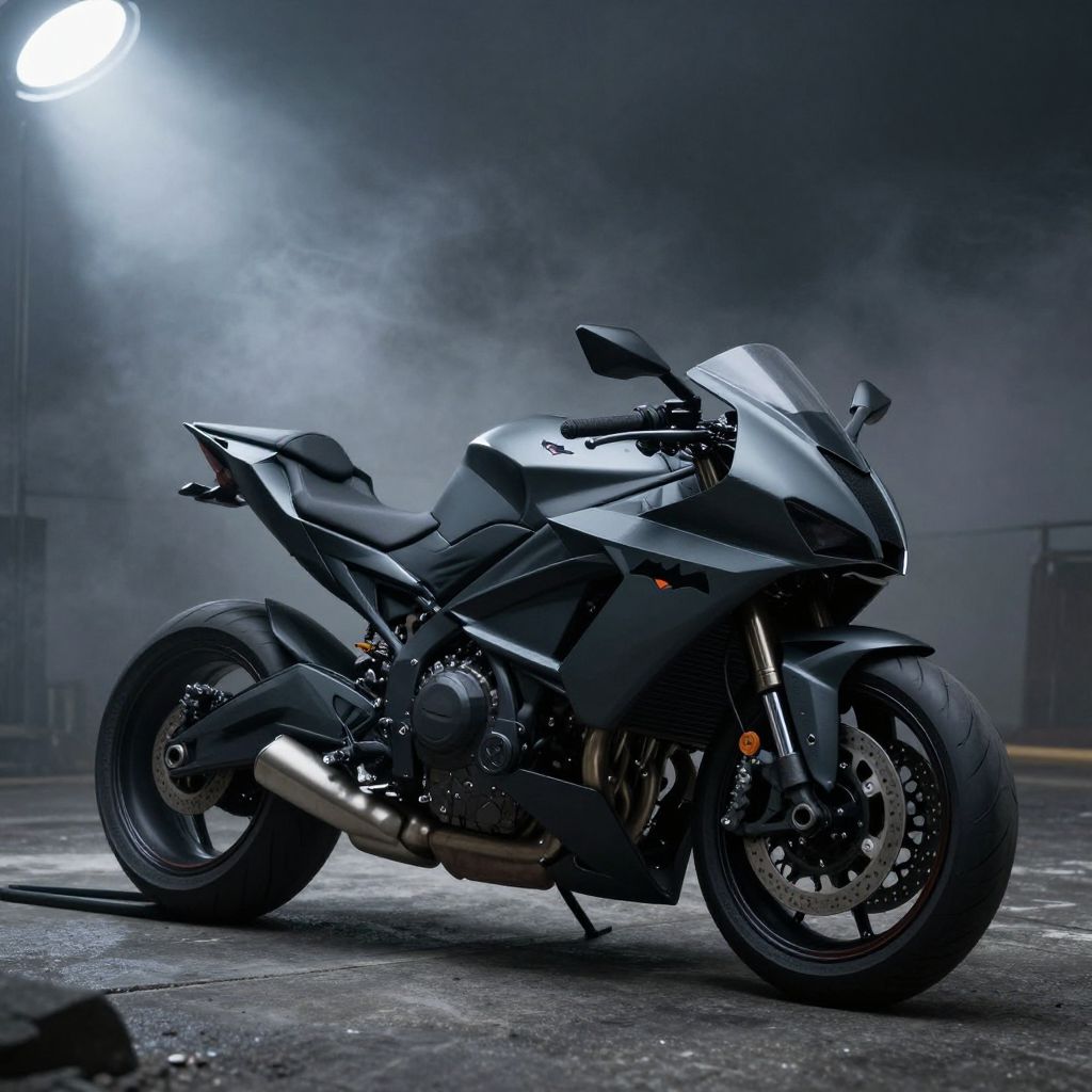 Photograph of a sleek, black sport motorcycle with angular lines and a transparent windscreen, parked on a foggy, dimly lit concrete surface. The motorcycle has a silver exhaust pipe and black tires with visible tread. Light from an overhead source creates a bright, white glare in the upper left corner, casting shadows and highlighting the motorcycle's glossy finish and aerodynamic design. The background is misty, with indistinct structures faintly visible, adding a mysterious, nighttime atmosphere to the image.