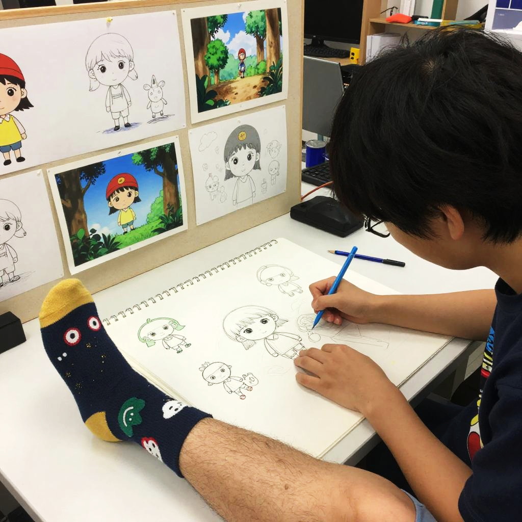 Realistic photo.a whimsical animator, wearing quirky socks and graphic tees, drawing on a blank sketchpad, surrounded by playful character sketches and animated frames, in a vibrant animation studio, depicted in the refined and narrative-driven style of Takeshi Obata. realistic photo