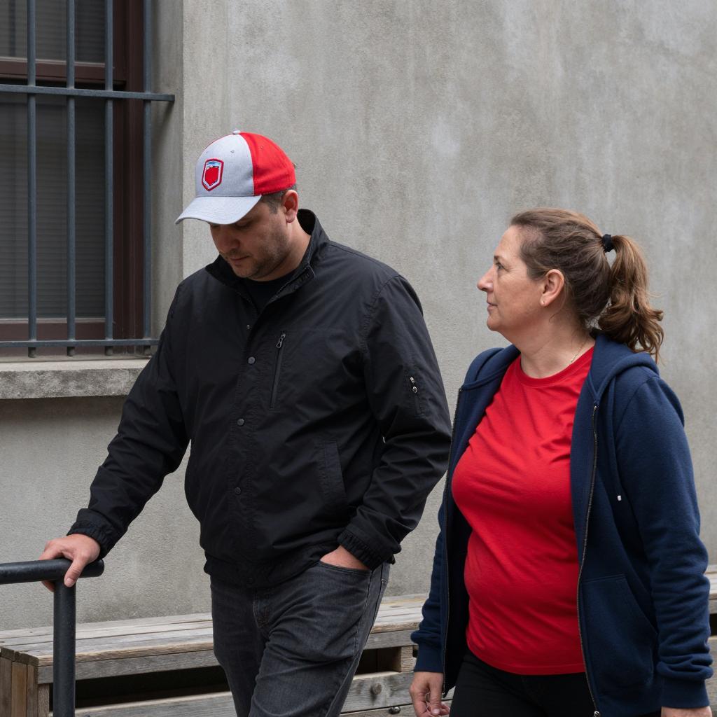 Two people walking outdoors. Man on left, medium build, wearing black jacket, red and gray baseball cap, looking down. Woman on right, medium build, red shirt, dark blue hoodie, brown hair in ponytail, looking at man. Gray concrete building wall in background, metal bars on window, wooden planks on ground. Man's hands resting on railing.