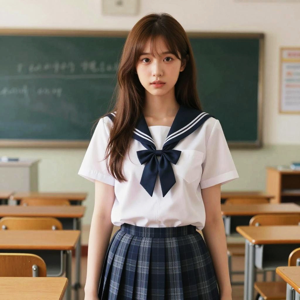 {2-3$$(film grain:0.9)|(vhs video:0.8)|({old|} analog film photography:0.8)|chromatic aberration}1girl, (young), (no make-up), (round face), ((mouth close)), look at viewer, detailed eyes, realistic, classroom, sitting on chair, ((half body)), macro lens, brown ponytail hair, (MAHALAIUNIFORM), (WHITE oversize SHORT SLEEVES SHIRT ), (BLACK PENCIL SKIRT)