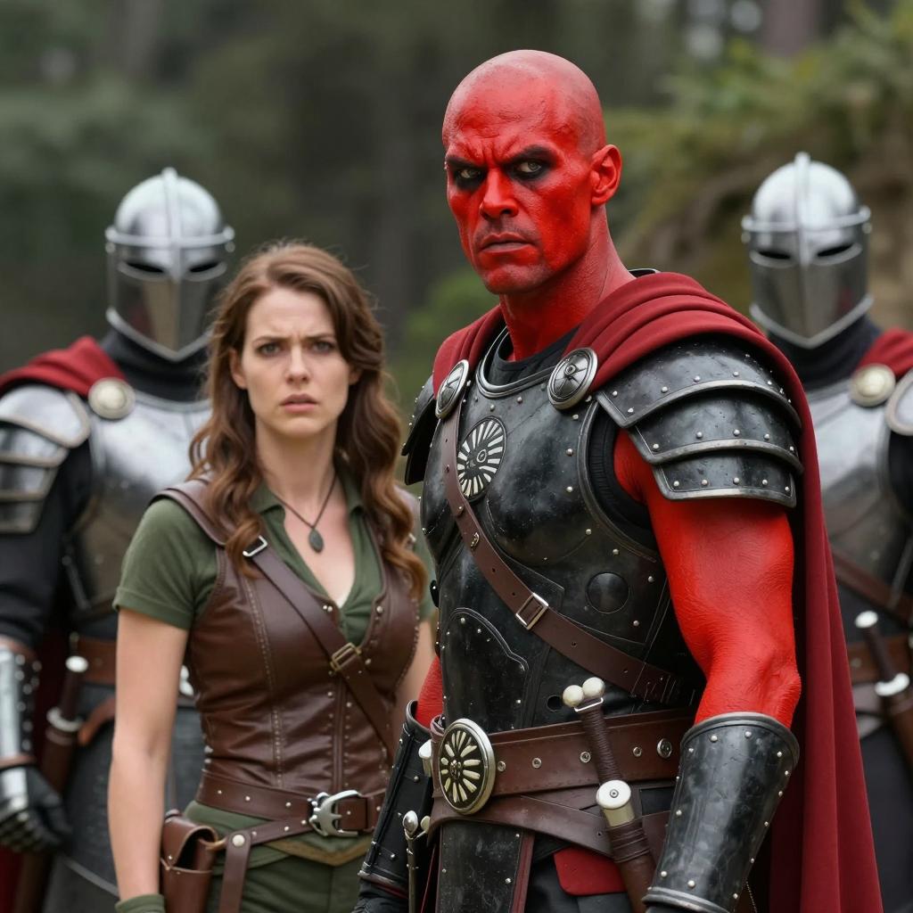 Bald man with red-painted skin and black armor, wearing a red cape, stands beside a woman with brown hair and a green top, brown vest, and a skeletal glove. Two armored men with white helmets and red cloaks are in the background. Dense green foliage is in the background. The man has a determined expression, and the woman looks concerned. Three people total. Realistic style.