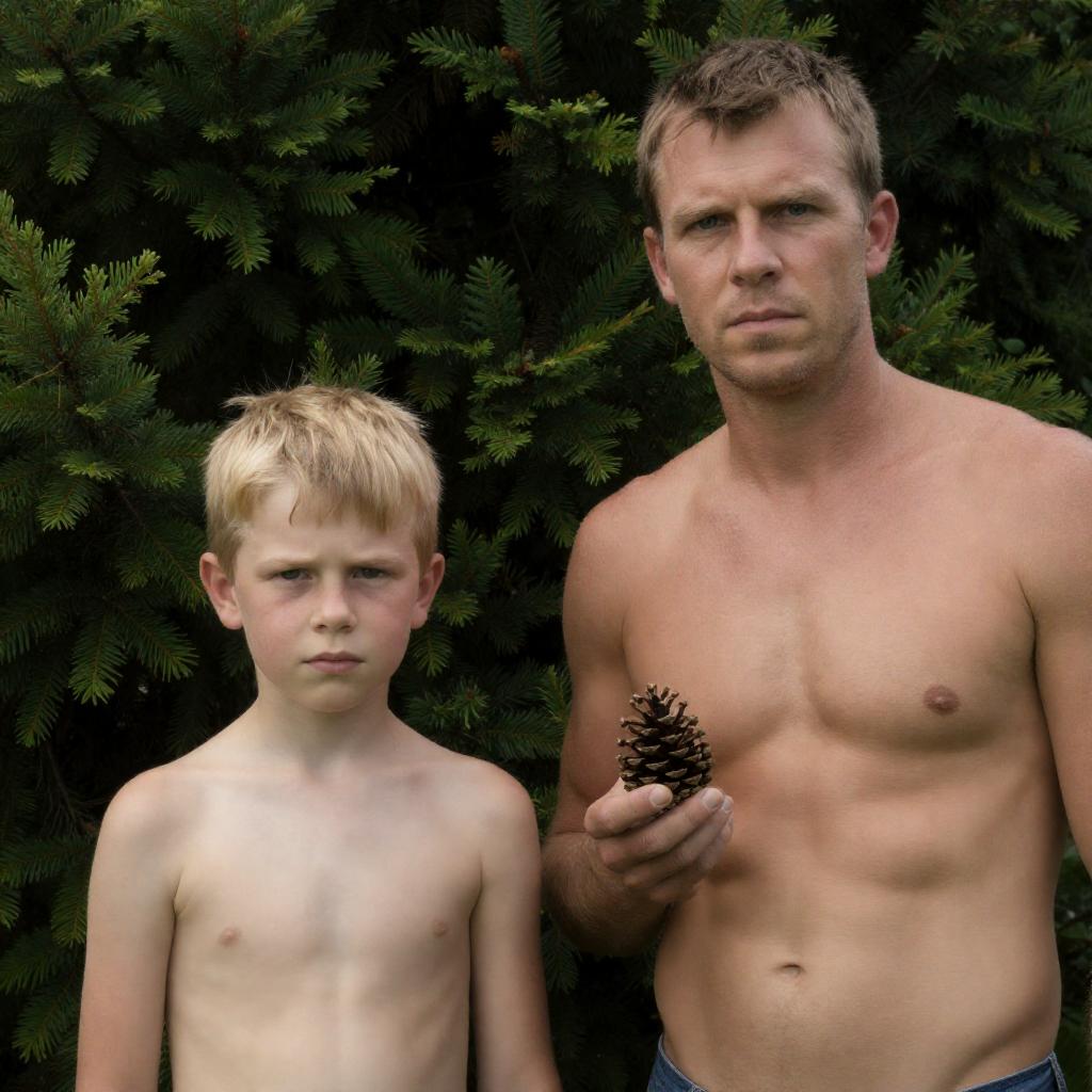 Photograph of a shirtless man and young boy with blonde hair, both with serious expressions, standing in dense green foliage. Man on the right, boy on the left. Tall evergreen trees in background. Man holding a pine cone in right hand. Natural light.