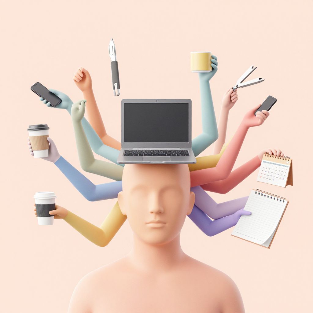 Digital illustration of a faceless, nude human with six colorful arms holding a laptop, coffee cups, pen, phone, notebook, and notepad.