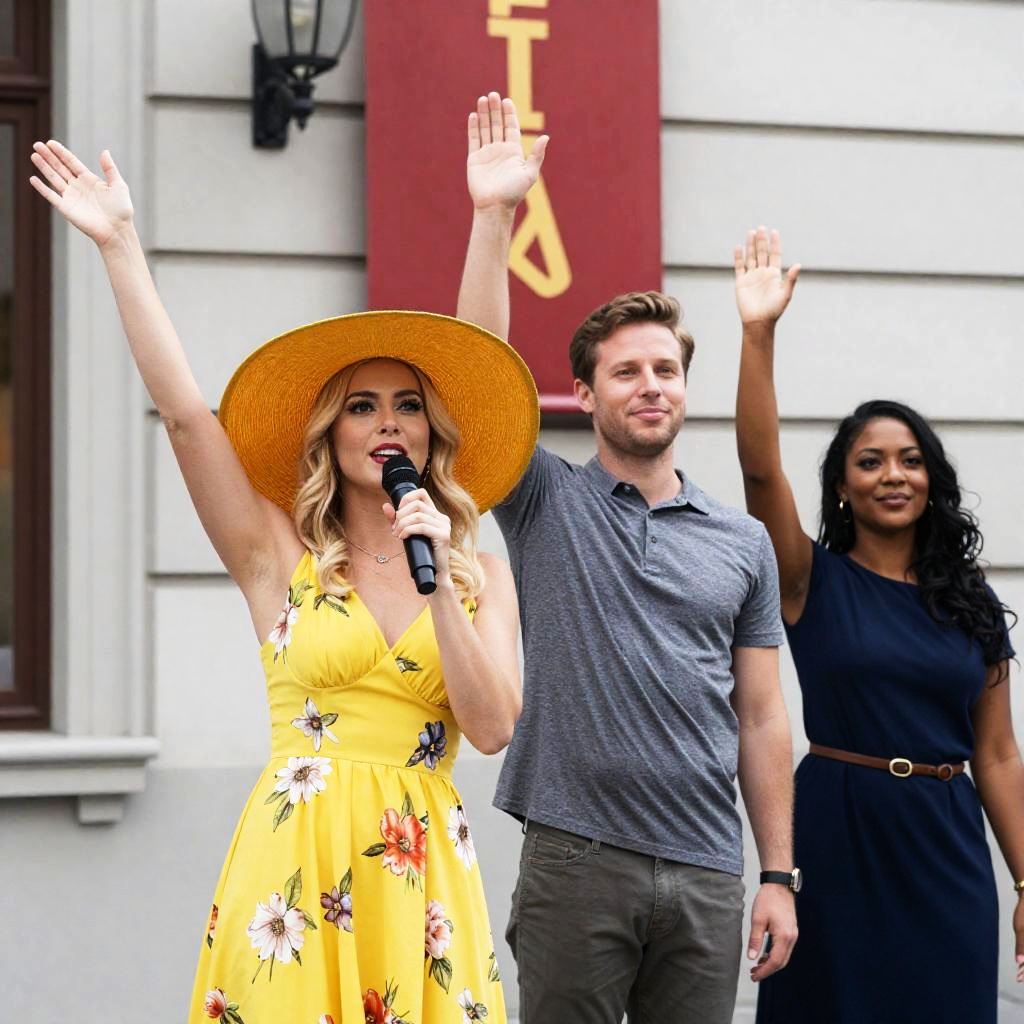 A blonde woman dressed in a white sleeveless dress singing into a microphone, standing among a diverse crowd of people who are raising their hands in excitement. The crowd includes men and women, some wearing blue clothing and accessories. A bright camera flash is visible in the foreground, capturing the lively atmosphere of the event.