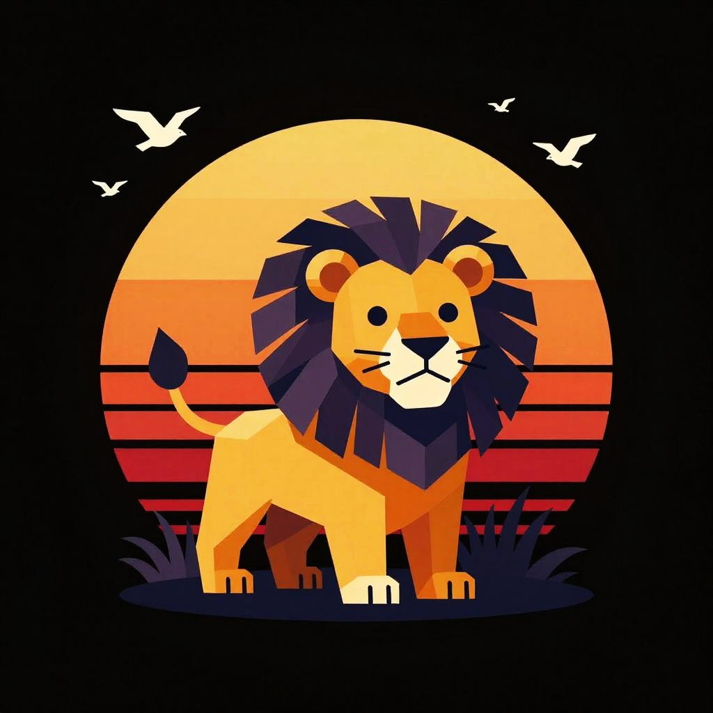 A low-poly vector art illustration of a cute and quirky lion standing against a warm, striped sunset background. The design features soft lighting and a black backdrop, with white birds flying above. The image has a retro aesthetic with isometric style influences, suitable for t-shirt art and digital painting.