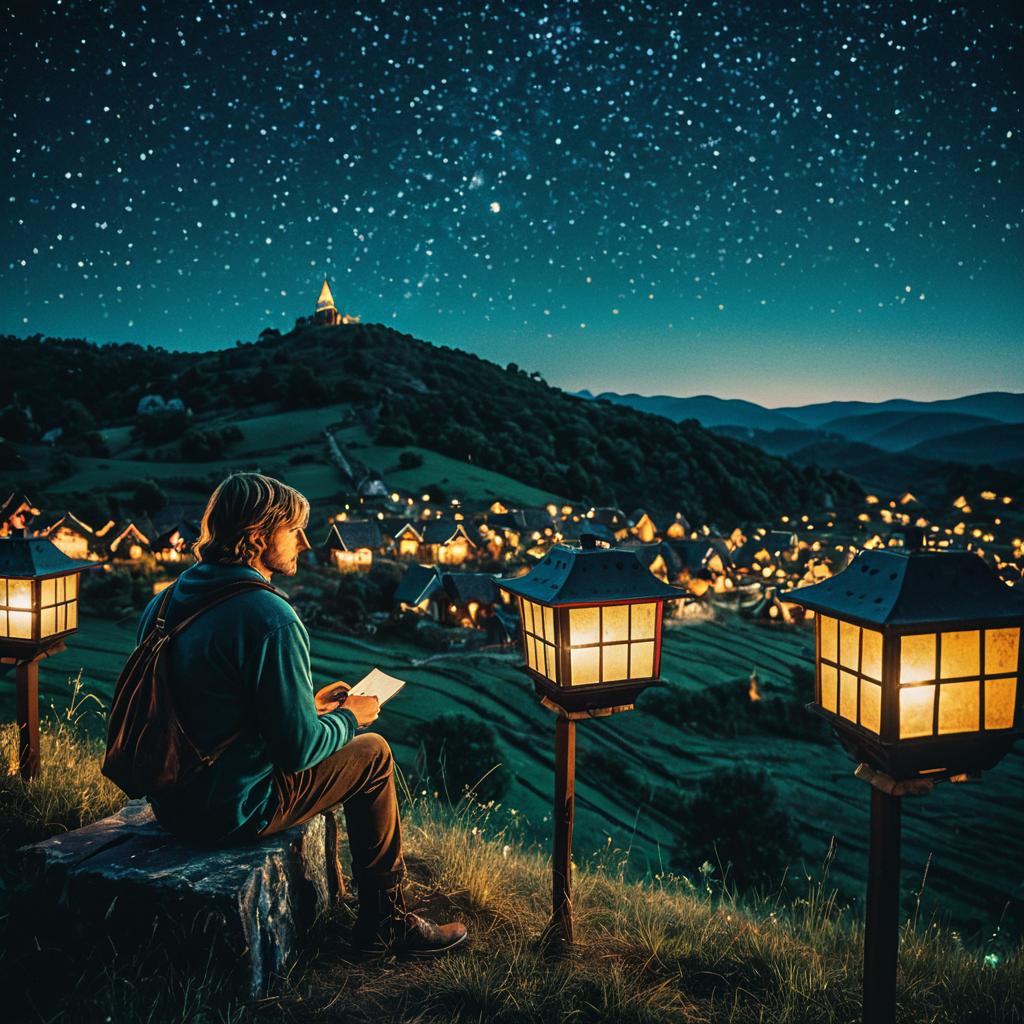 80s Polaroid photo of Link styled as a cinema still from a movie, watching over a mystical village lit by lanterns under a starry sky. The scene exudes an Americana vibe with high production value, captured in 6K, vivid details, high definition. Rendered in technicolor with award-winning photography quality, showcasing vibrant, amazing colors and intricate details that make it feel like a photorealistic masterpiece.