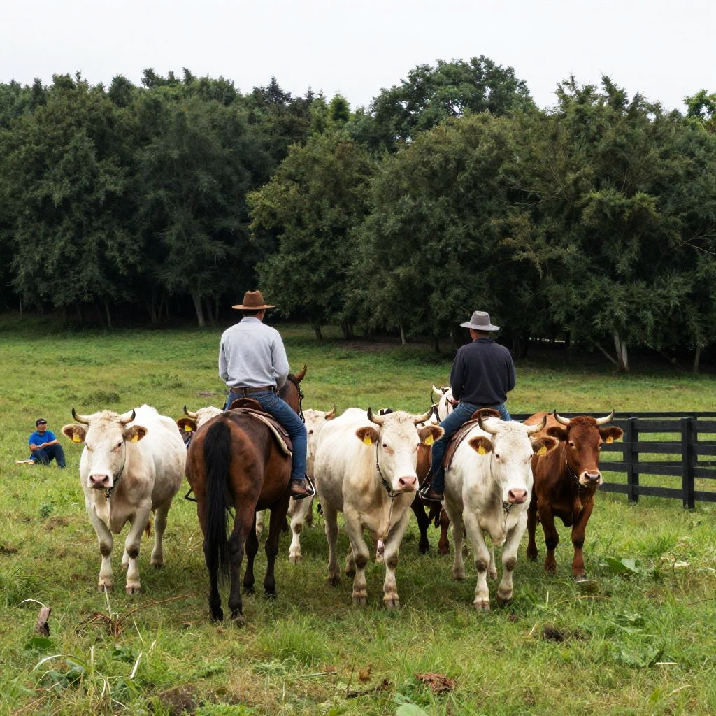 Photograph of two men riding horses on a grassy hill, leading a herd of white and brown cows. One man wears a brown hat, the other a gray hat. A third person sits on the left. Wooden fence on the right. Dense forest in the background. Overcast sky.