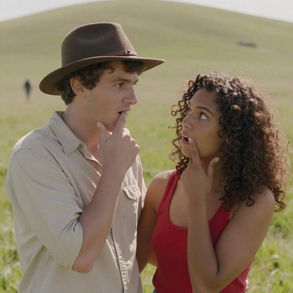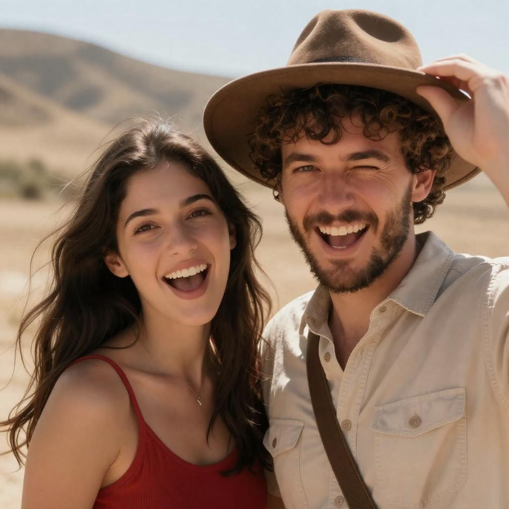 Photograph of a smiling man and woman outdoors. Man with light brown beard, short curly hair, beige shirt, holding brown hat. Woman with curly dark hair, red tank top, smiling. Both in front of green hill and distant mountains. Sunlight. Man's shoulder strap visible. Woman's shoulder slightly behind man's. Clear sky.