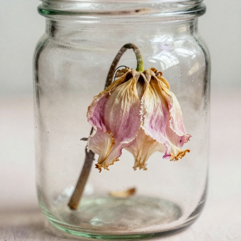 Strained artistic concept of a wilting flower in an abandoned glass jar, soft soft-focus background with faded pastel colors, detailed petals showing signs of dryness and decay, melancholic mood, delicate watercolor style with fine brush strokes and subtle light play.