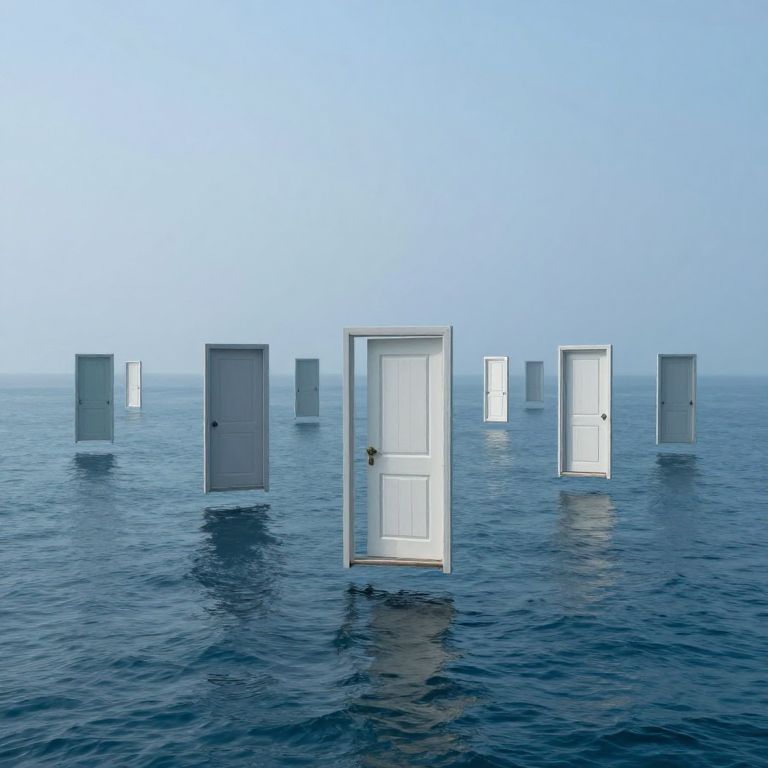Suspended between the infinite expanse of sea and sky, a surreal archipelago of floating doorways invites introspection into the void, where the promise of elsewhere lingers as a haunting echo of unfulfilled longing.