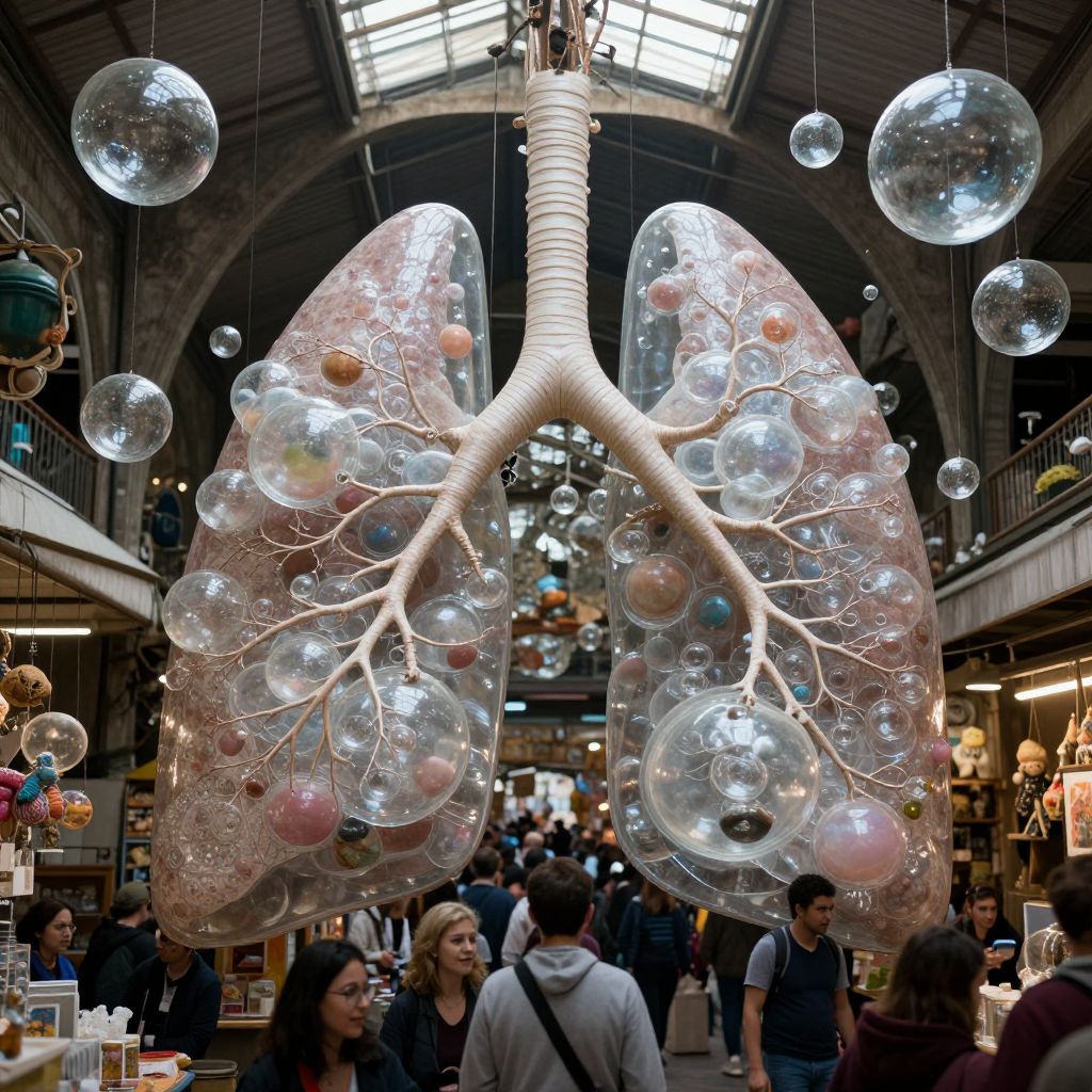 In the heart of a labyrinthine marketplace, a colossal, pulsating lung made of glass bubbles and intricate branches hums with life, where the air carries the whispers of laughter, the weight of silences, and the fragility of dreams, weaving a tapestry of human connection amidst the eternal rhythm of breath.